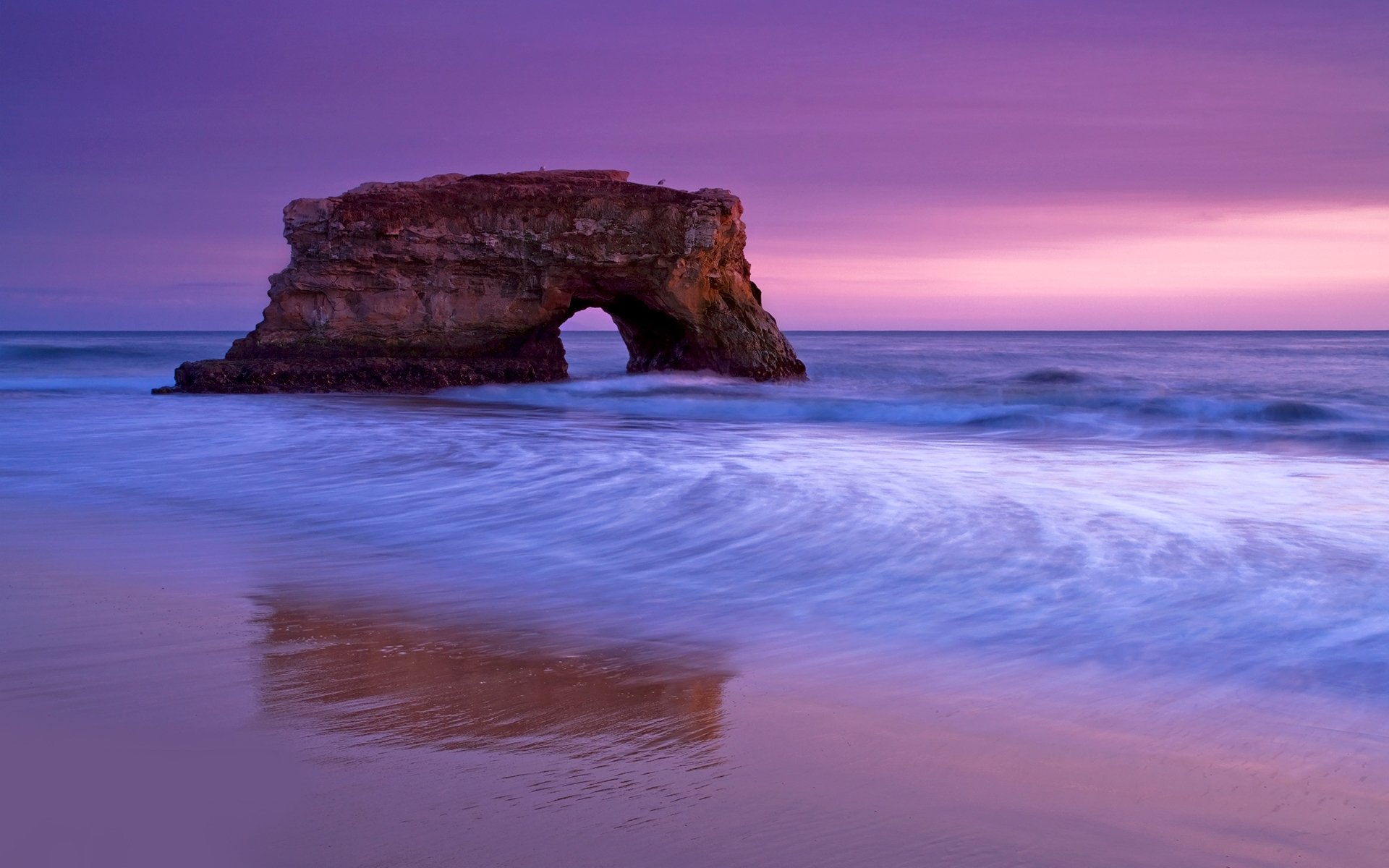Roches dans la mer au coucher du soleil rose