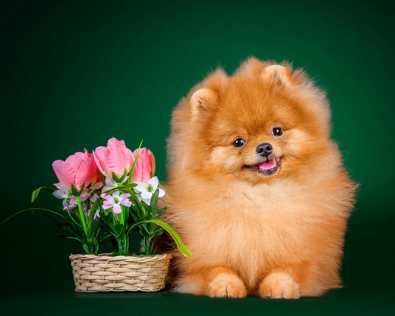 Spitz Rousse aux tulipes roses