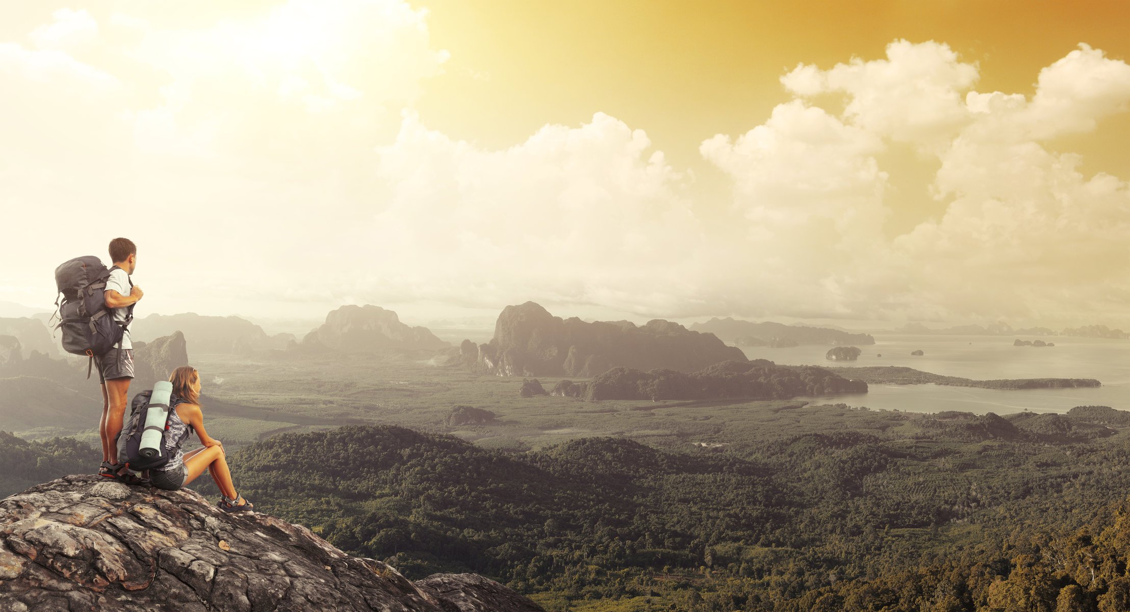 Fille avec un mec avec des sacs à dos voyageant dans les montagnes