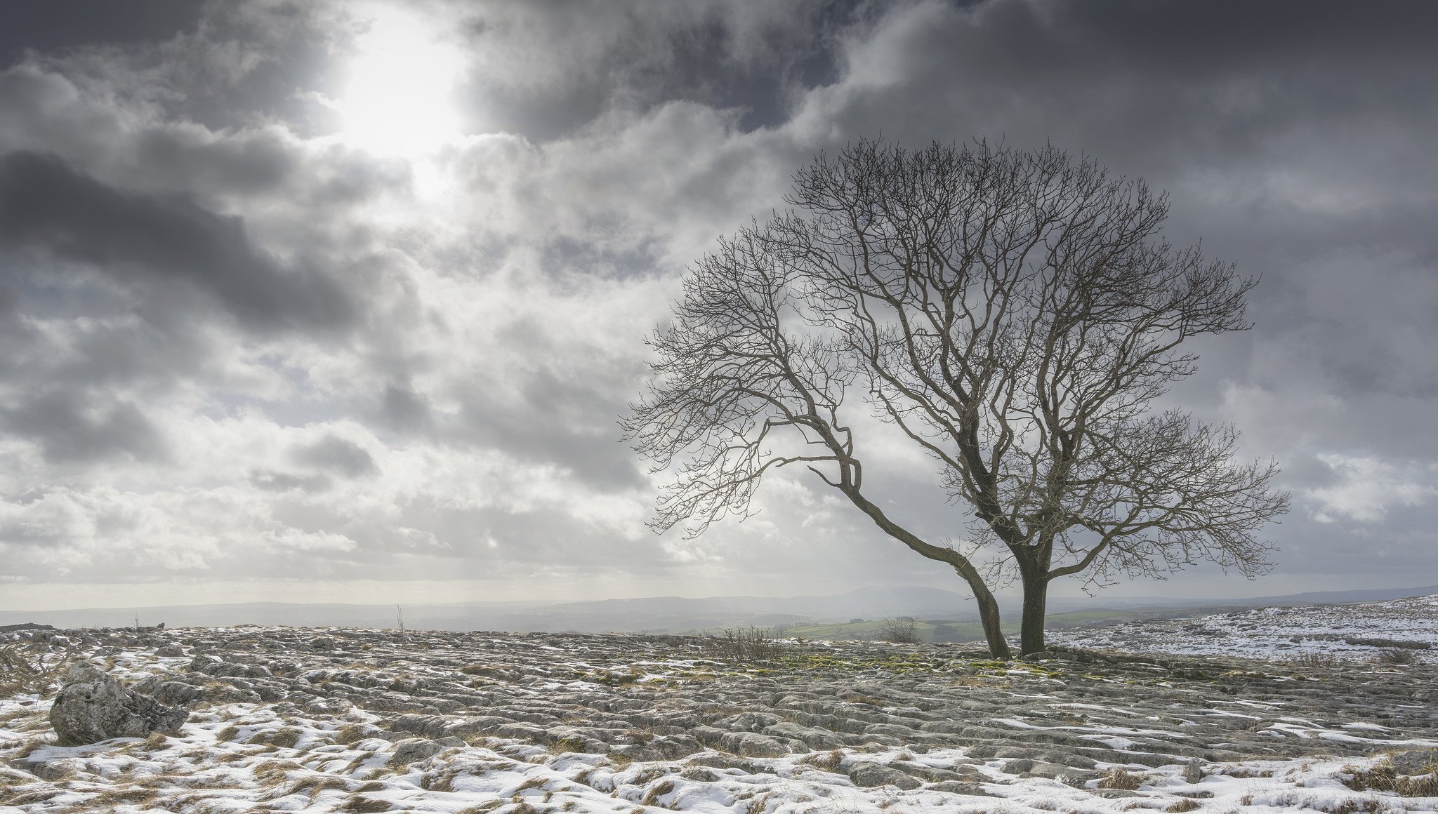 Arbres dans le champ avec la première neige se cachant dans le brouillard