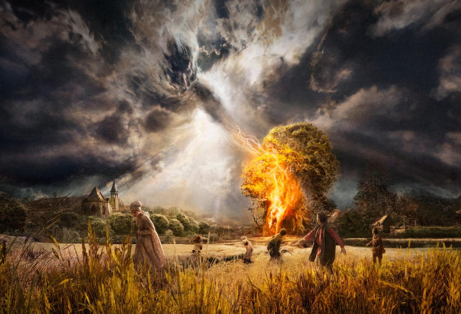 Coup de foudre divin dans le champ sur le fond du châteauCoup de foudre divin dans le champ sur le fond du château