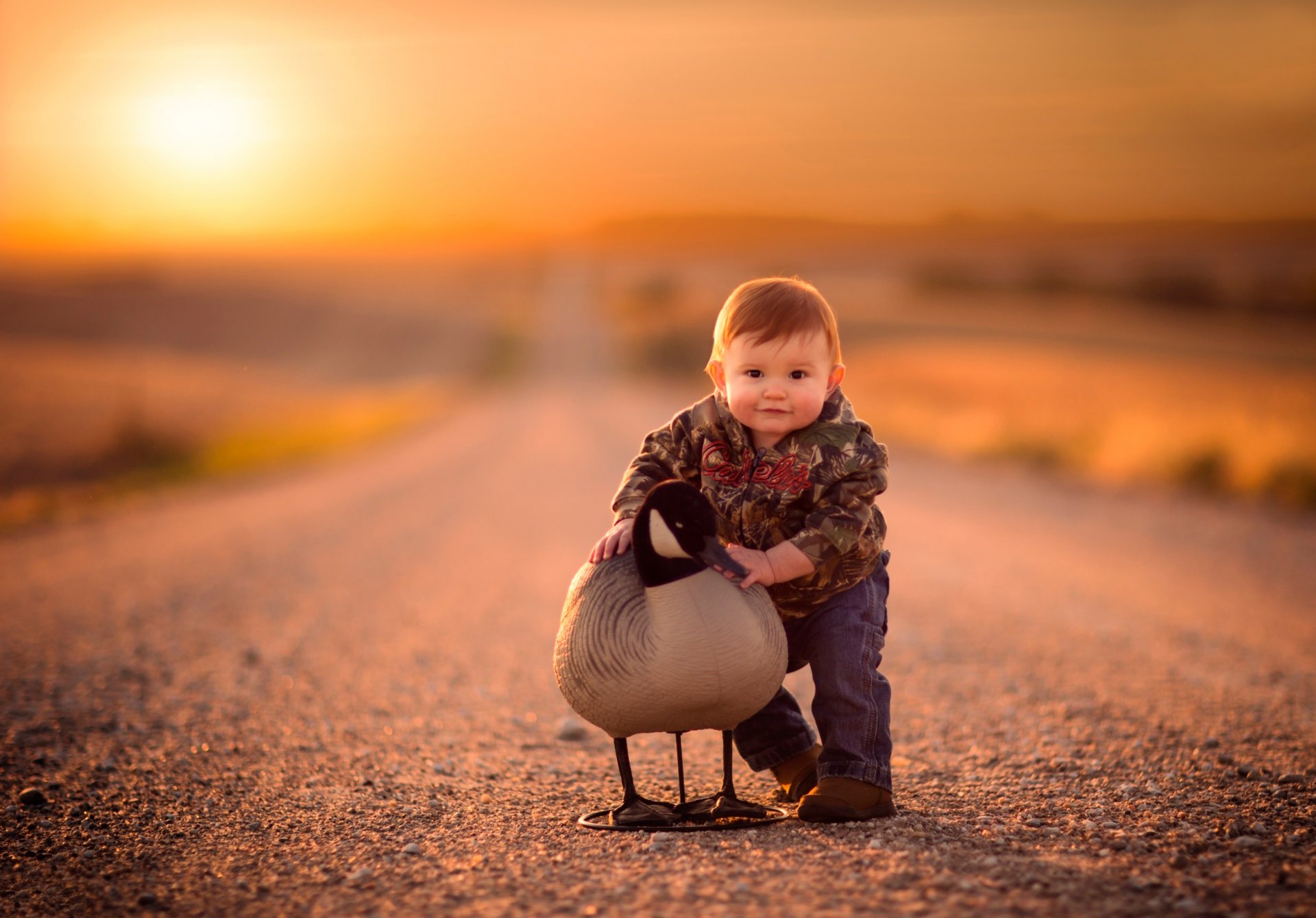 Route ensoleillée avec un garçon étreignant un oiseauRoute ensoleillée avec un garçon étreignant un oiseau