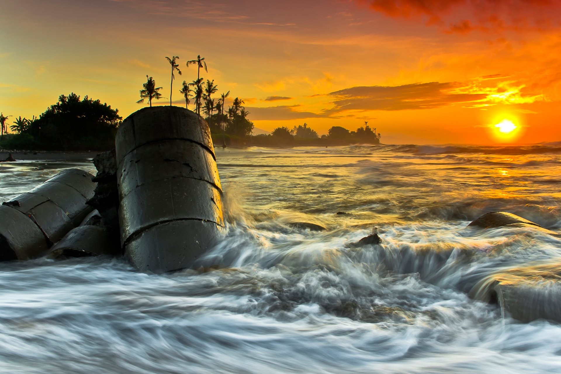 Tonneaux dans la mer sur fond de coucher de soleilTonneaux dans la mer sur fond de coucher de soleil