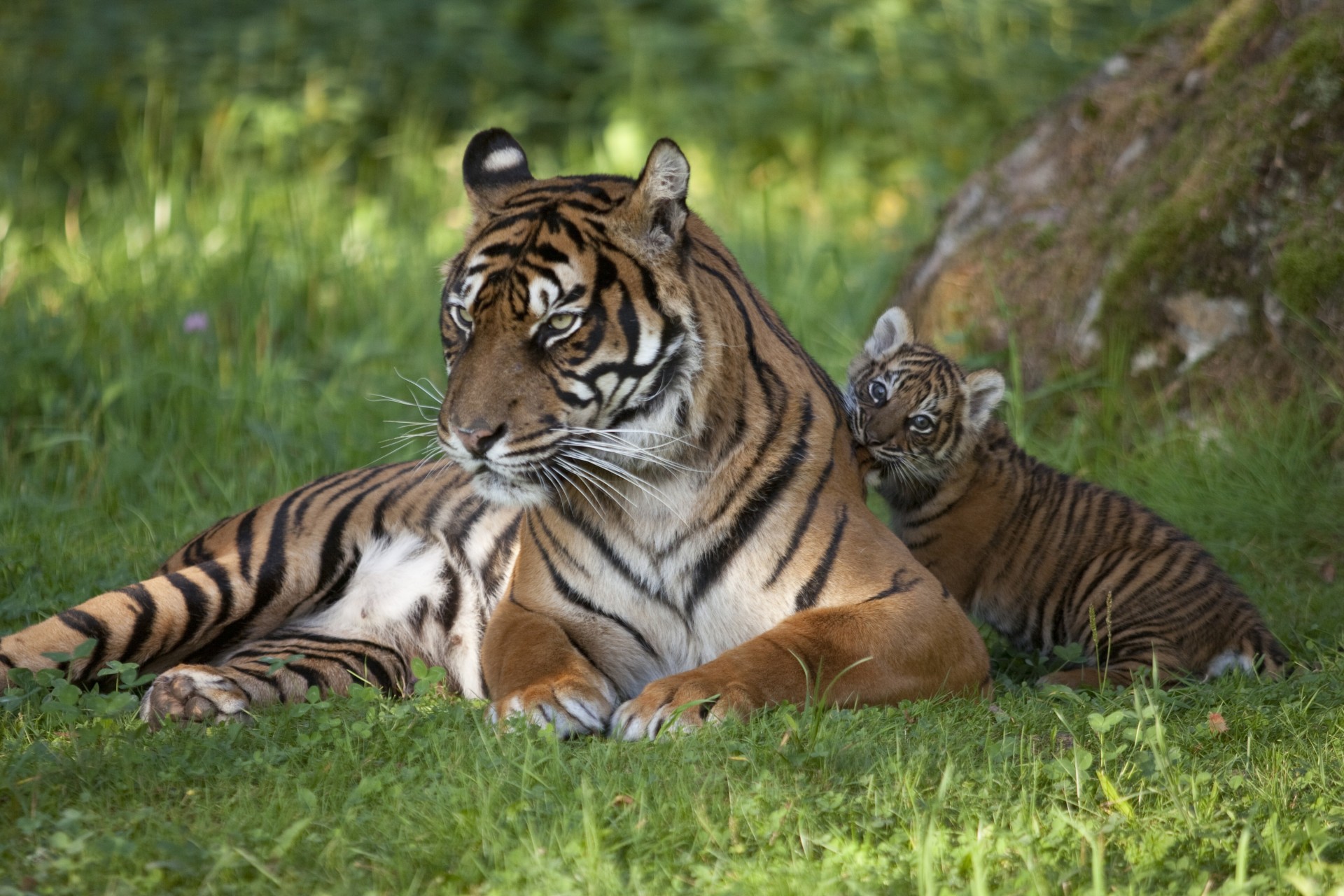 Tigresse avec un enfant au repos à l'ombre d'un arbreTigresse avec un enfant au repos à l'ombre d'un arbre