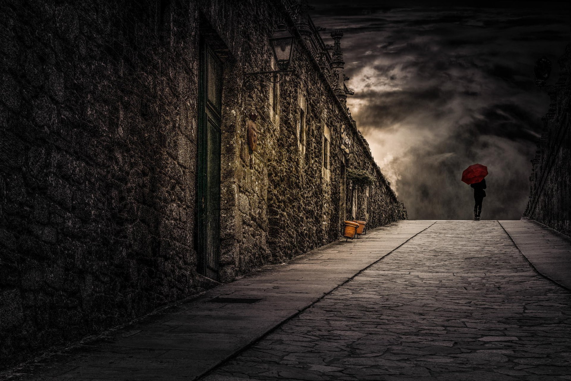Image sombre d'un homme avec un parapluie, un faisceau lumineux de lumière dans l'obscuritéImage sombre d'un homme avec un parapluie, un faisceau lumineux de lumière dans l'obscurité