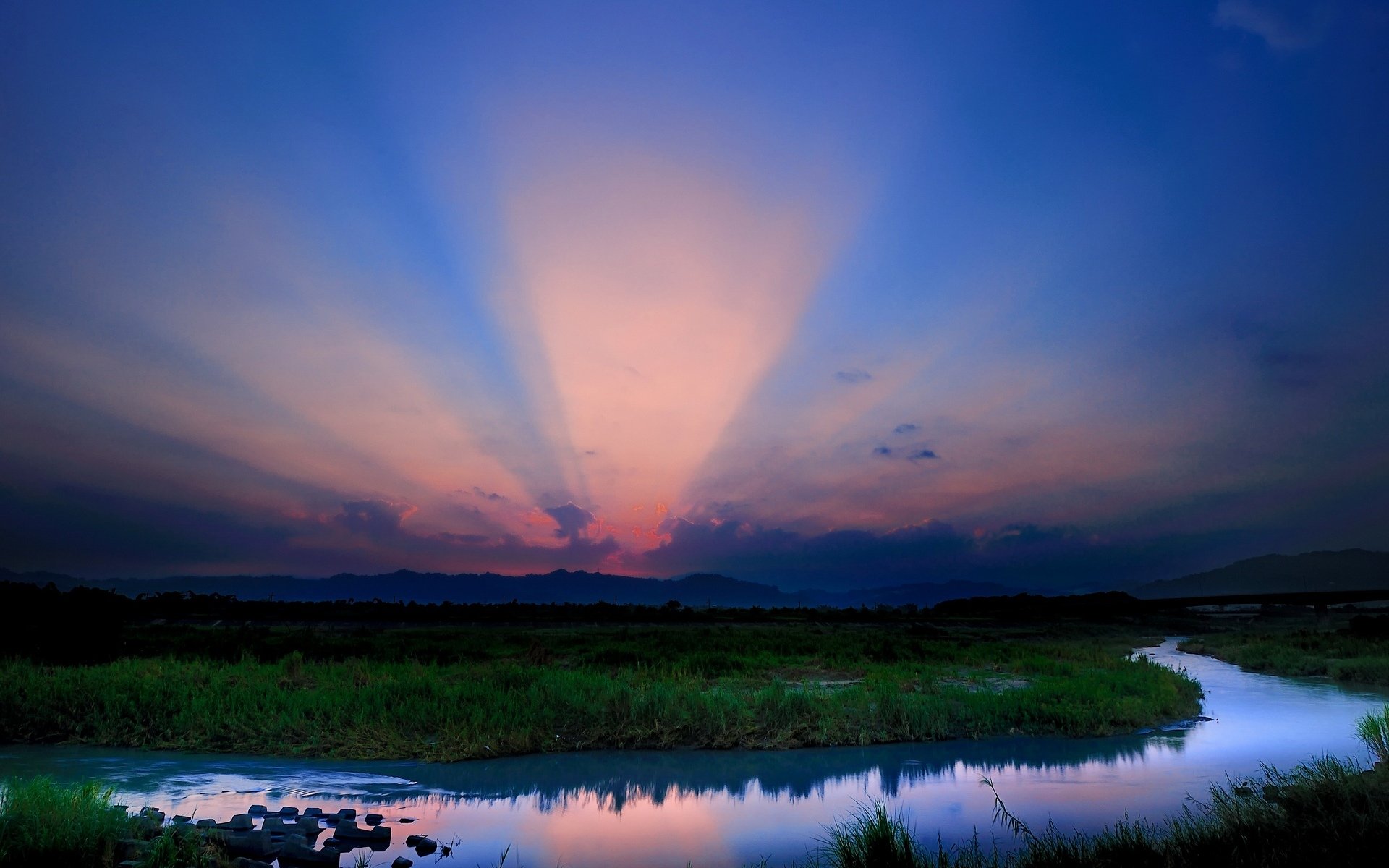 Nuages roses sur le fond de la surface bleue du lit de la rivièreNuages roses sur le fond de la surface bleue du lit de la rivière