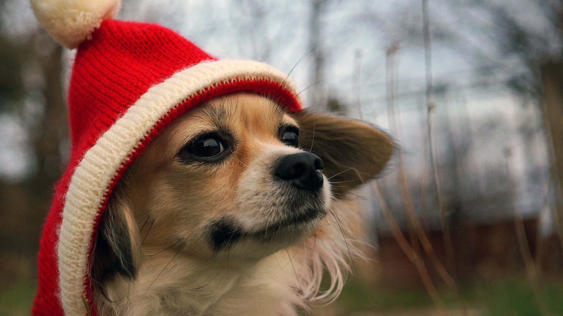 Rousse petit chien en rouge et blanc chapeau avec pompon regarde au loin