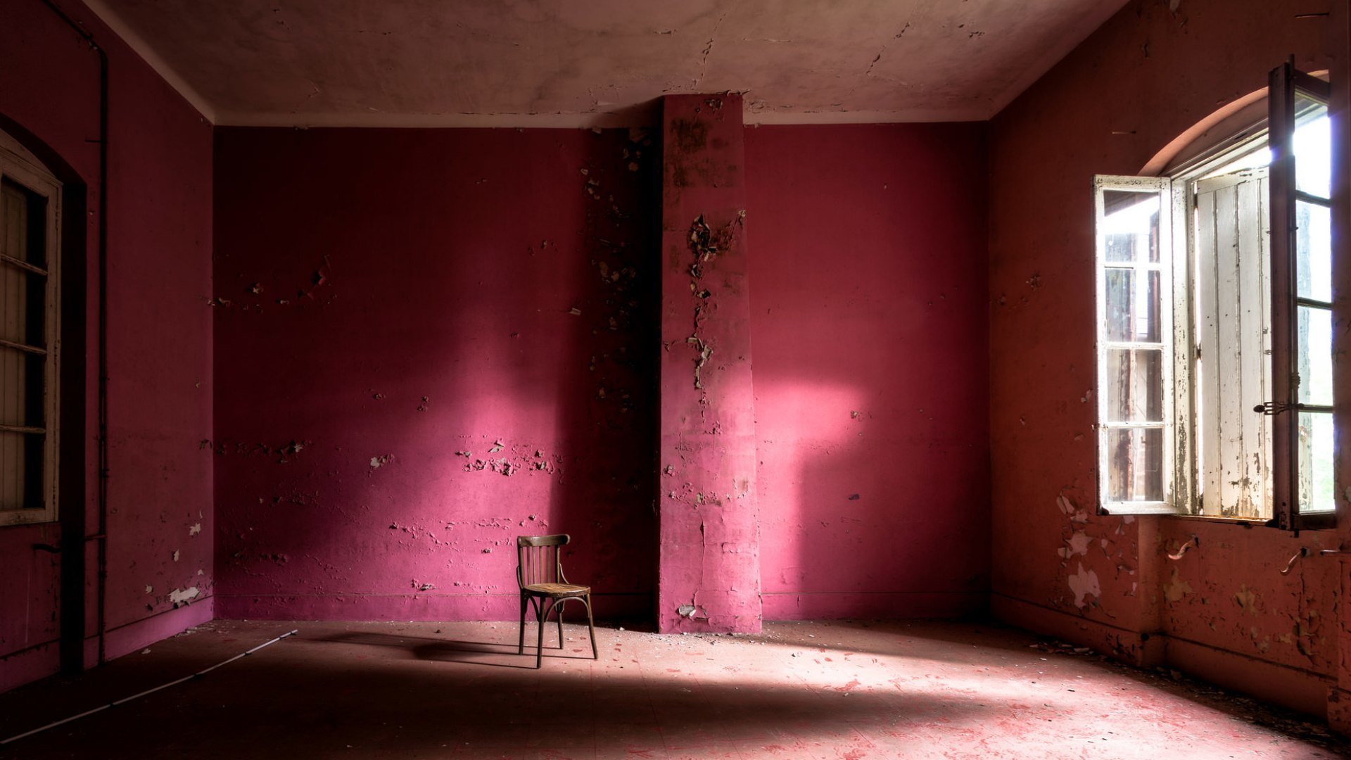 Sur le fond du mur de la cuisine, une vieille table et des chaises