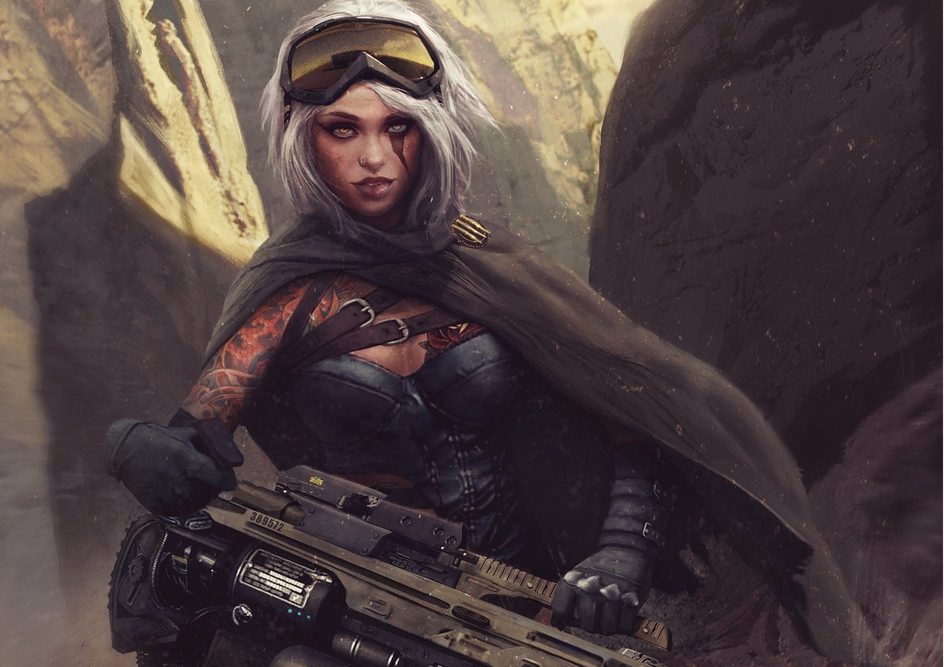 Отрубленная tête de monstre avec les crocs et la jeune fille le soldat deОтрубленная tête de monstre avec les crocs et la jeune fille le soldat de