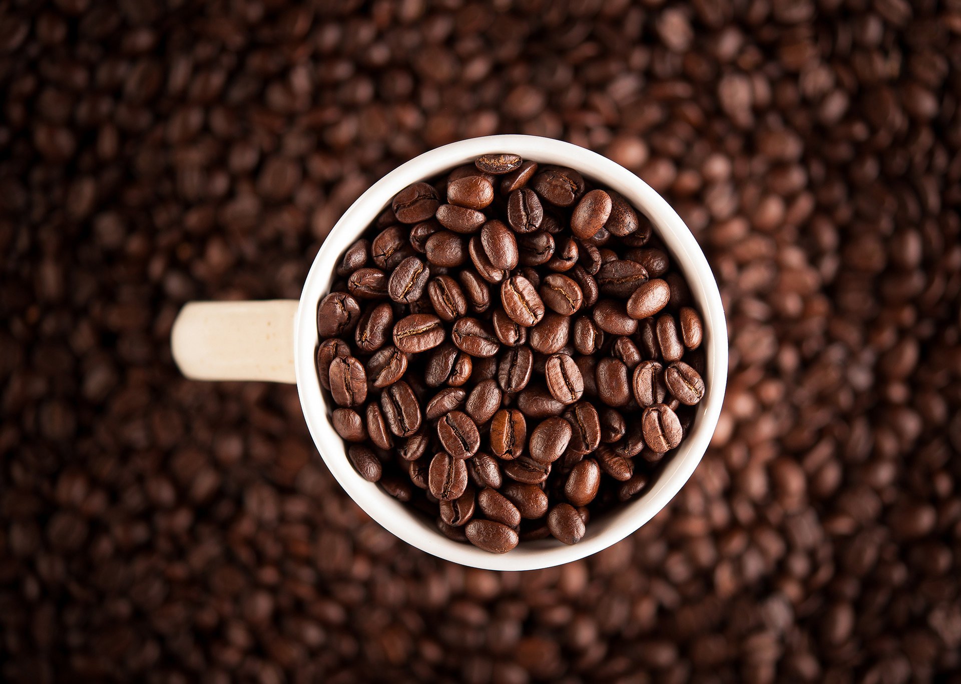 Grains de café sur une tasse blanche avec mise au point floueGrains de café sur une tasse blanche avec mise au point floue