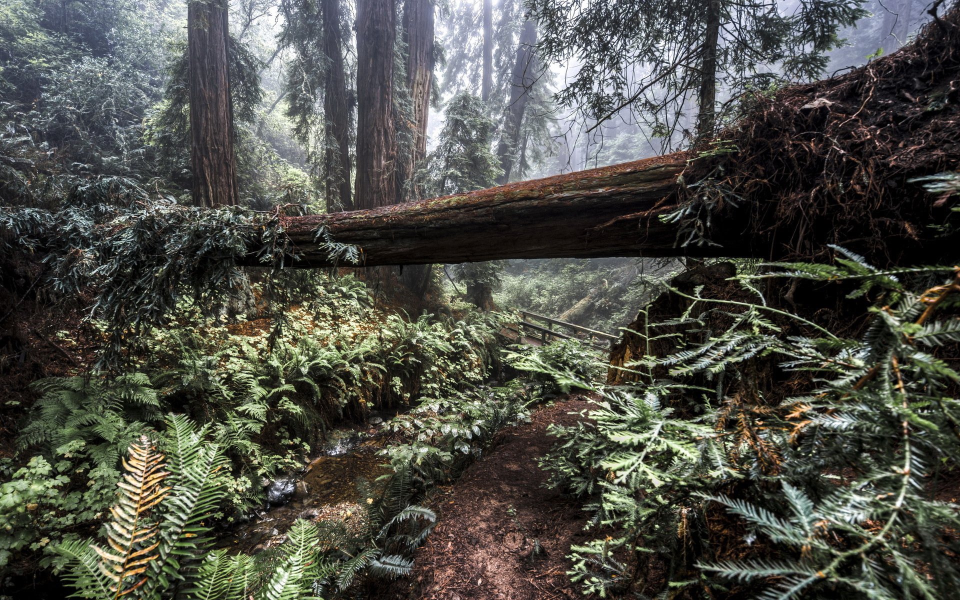 Forêt avec des arbres nus et des feuilles rouges tombéesForêt avec des arbres nus et des feuilles rouges tombées