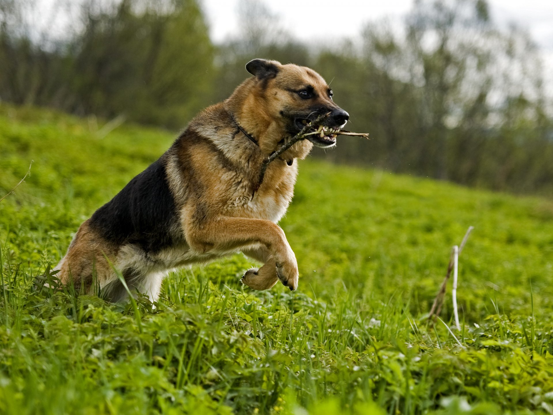 Chien qui court sur l'herbe avec un bâton dans les dentsChien qui court sur l'herbe avec un bâton dans les dents