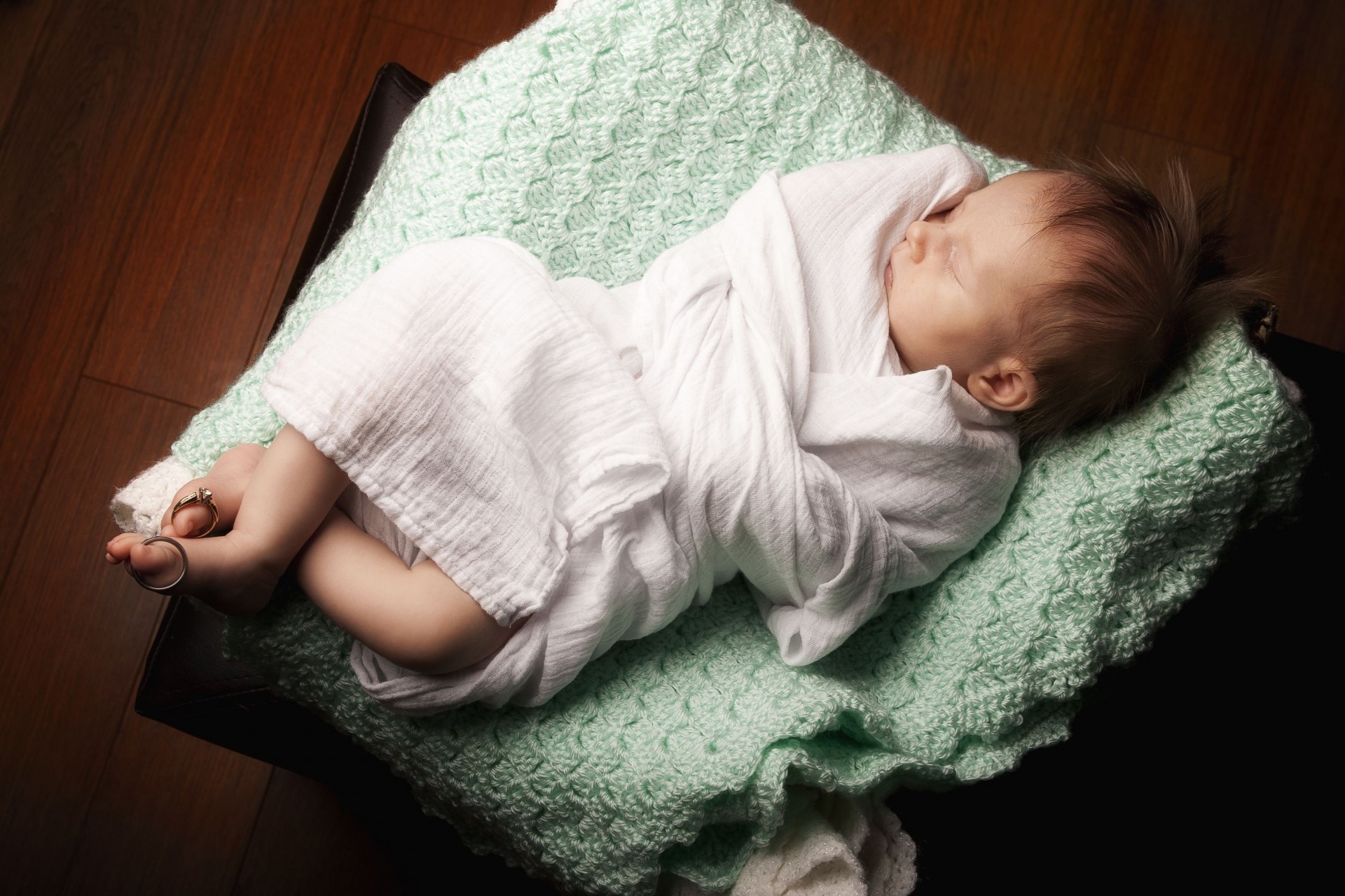 Bébé dort dans une couche avec des anneaux sur les jambesBébé dort dans une couche avec des anneaux sur les jambes