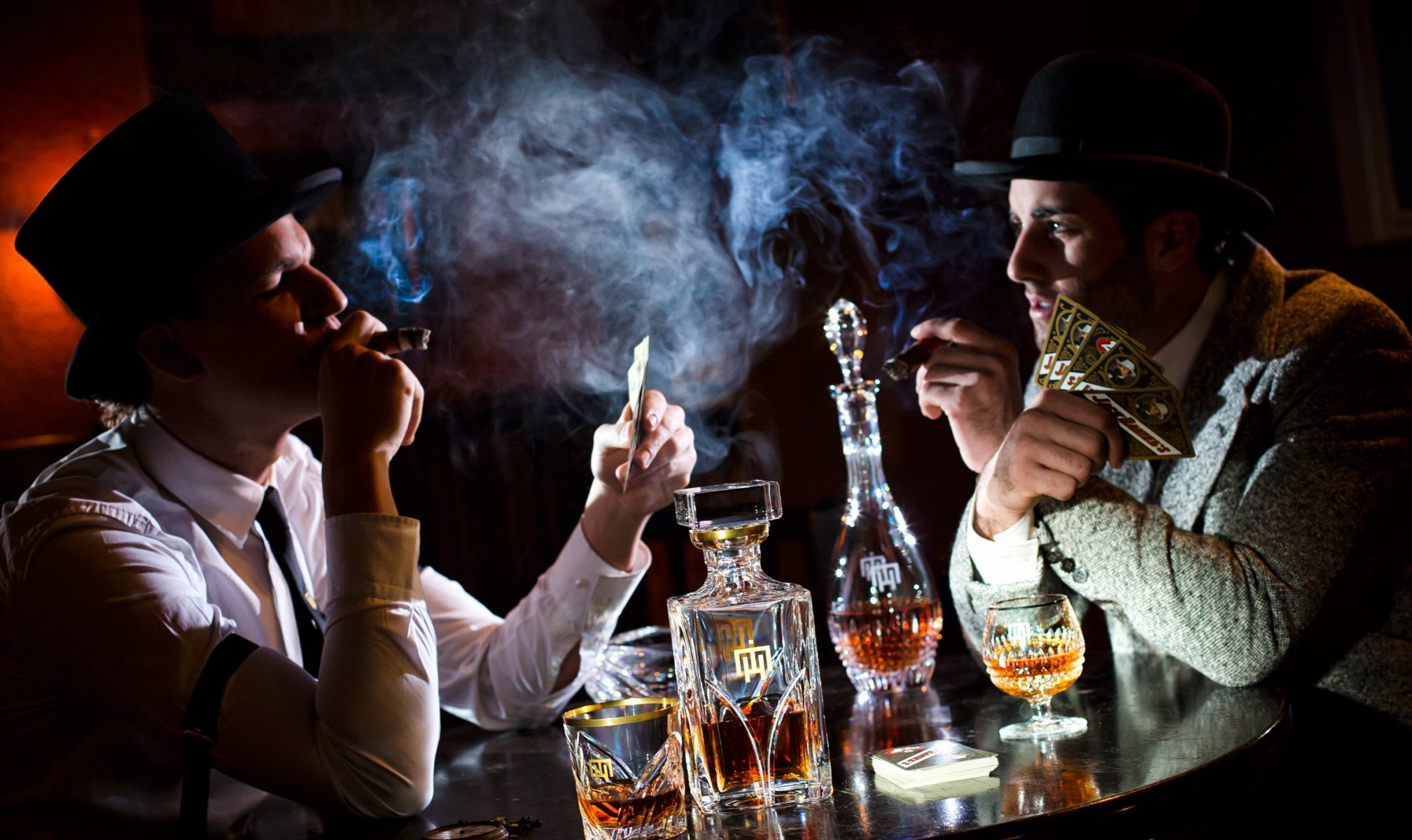 Deux hommes jouent aux cartes, fument et boivent à la table