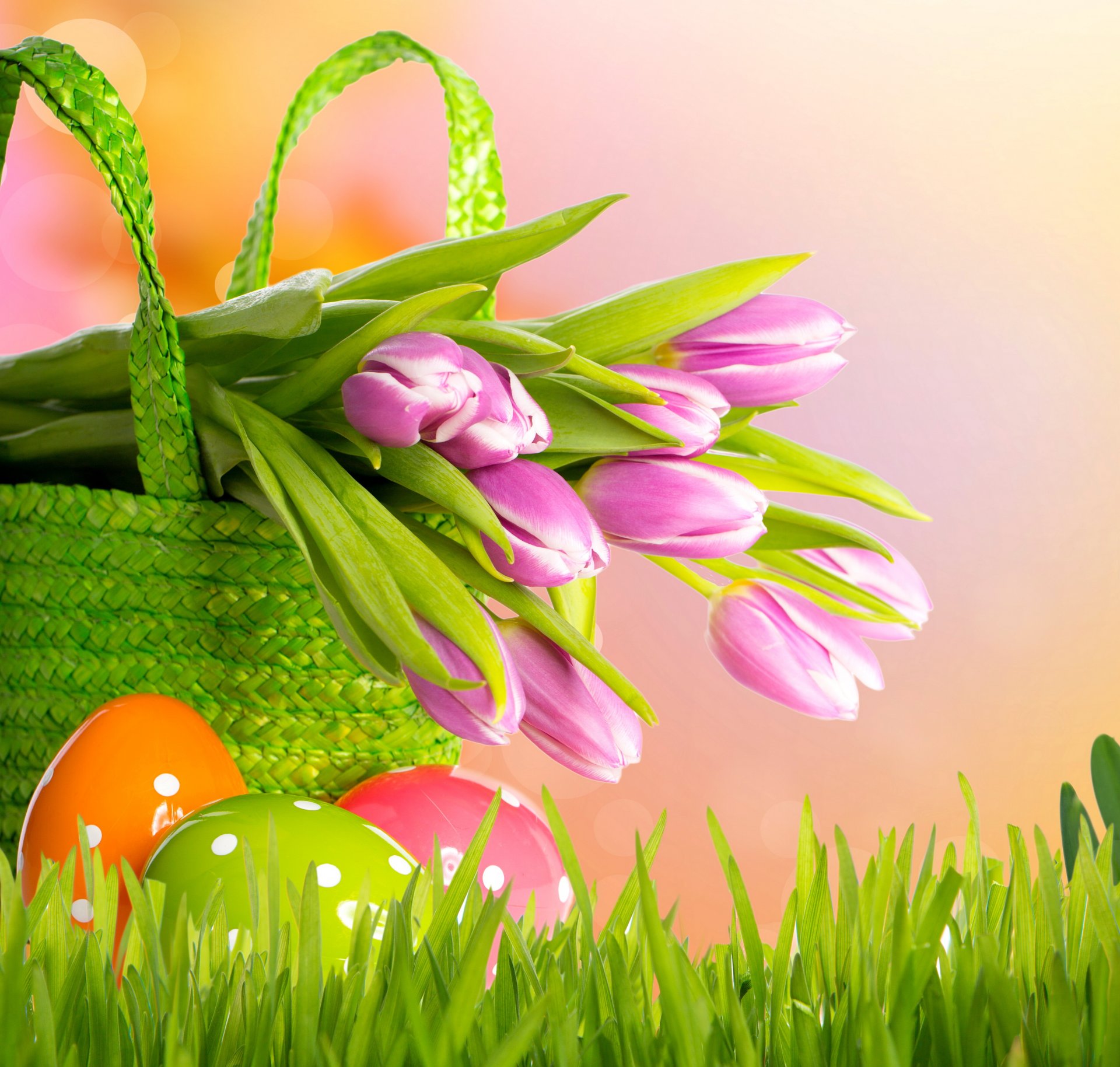 Sur l'herbe verte à côté d'un panier de fleurs se trouvent des oeufs de pâquesSur l'herbe verte à côté d'un panier de fleurs se trouvent des oeufs de Pâques