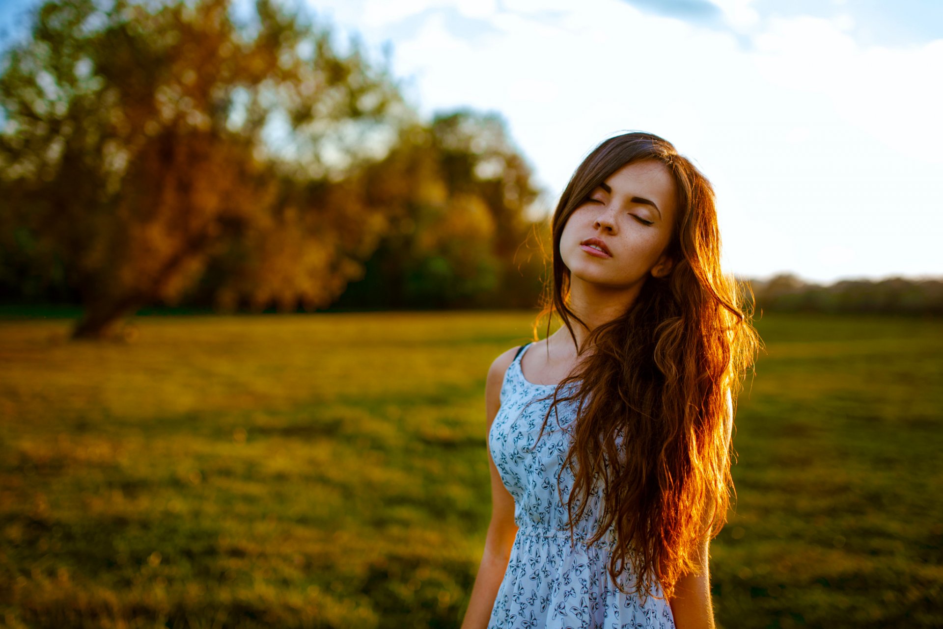 Fille aux cheveux longs et les yeux fermés se trouve dans la prairieFille aux cheveux longs et les yeux fermés se trouve dans la Prairie