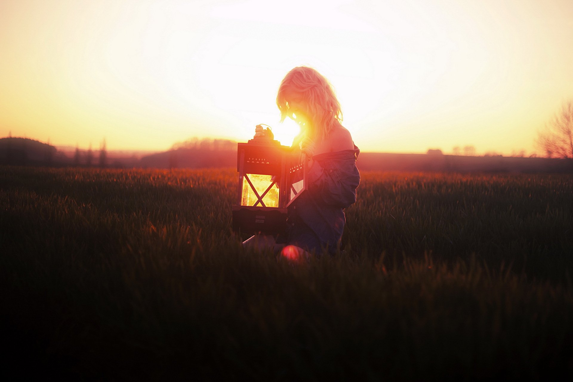 Jeune fille dans un champ avec une lampe au coucher du soleilJeune fille dans un champ avec une lampe au coucher du soleil