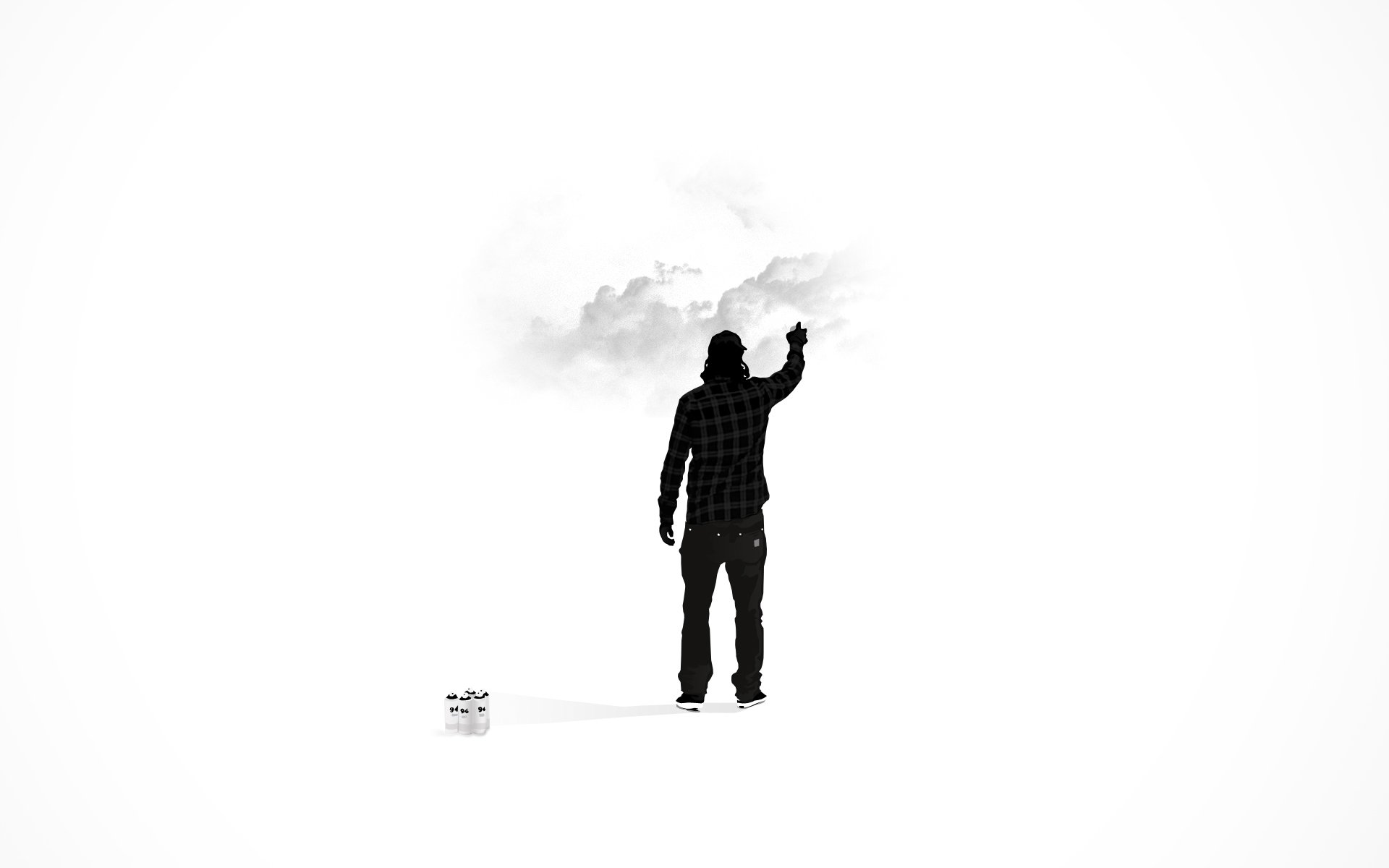 Fond jaune-vert au milieu de laquelle la silhouette noire d'un chat avec une souris dans la bouche