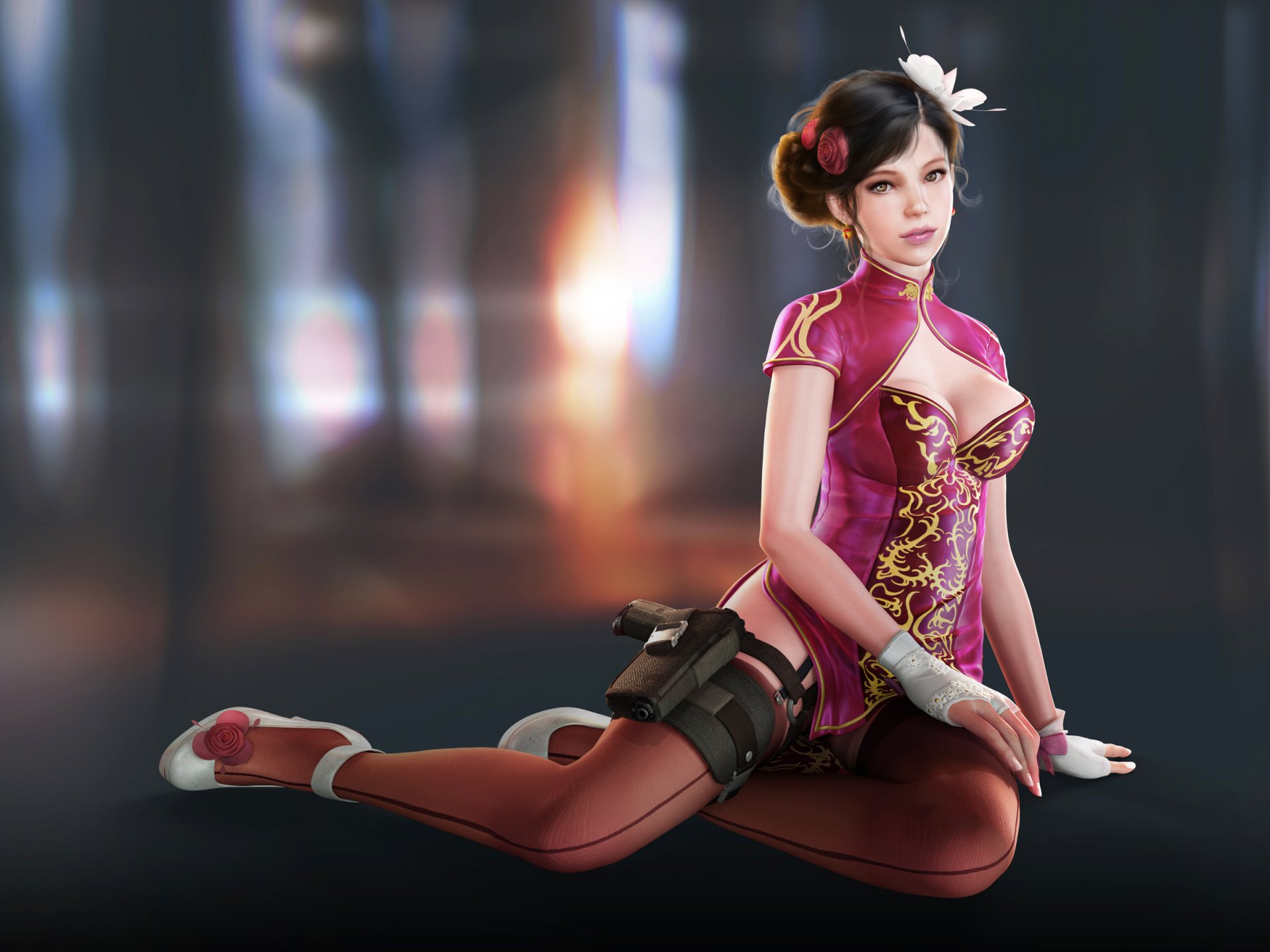 Fille aux cheveux noirs tient une arme dans ses mainsFille aux cheveux noirs tient une arme dans ses mains