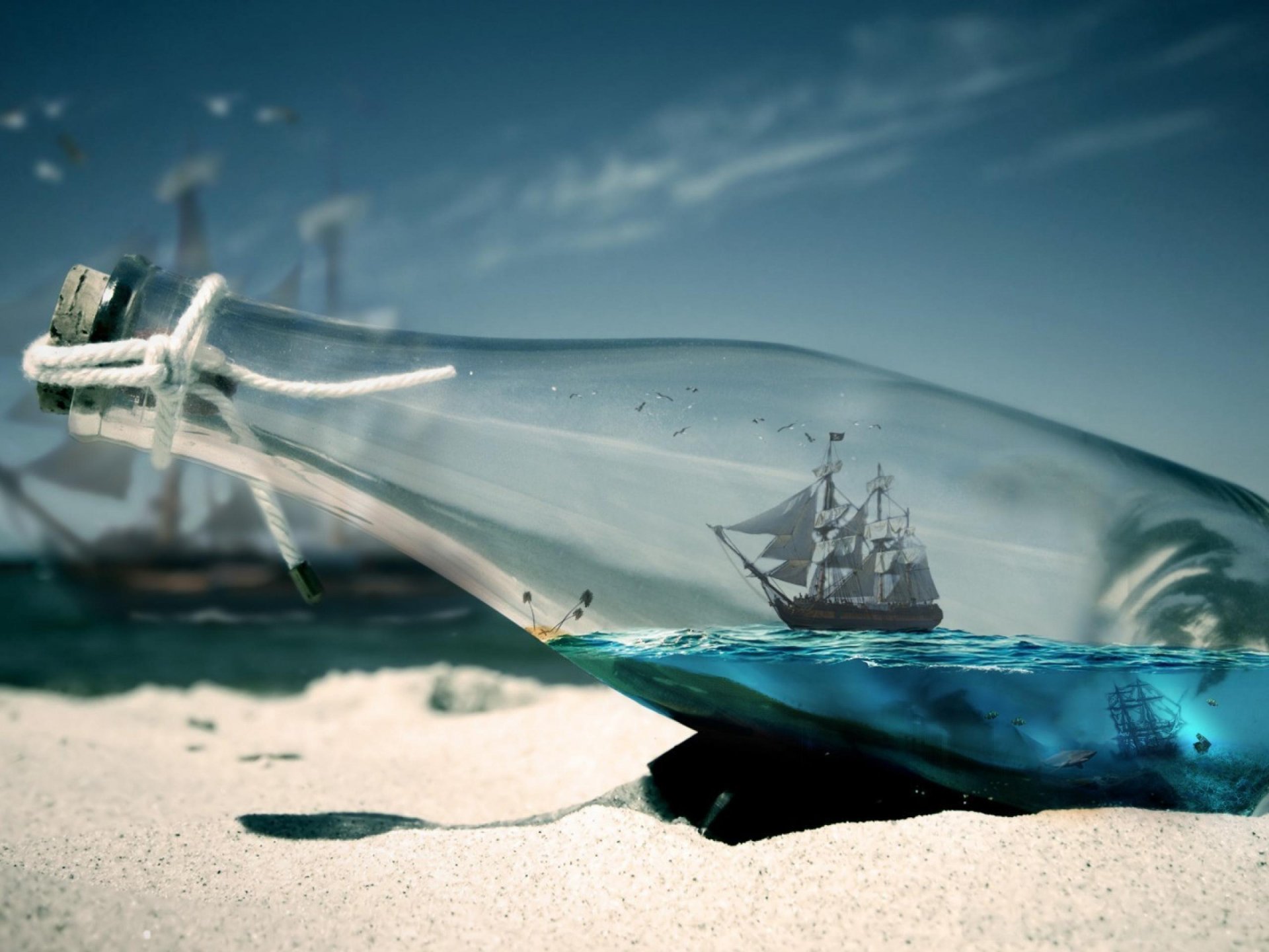 Un bateau dans une bouteille sur la surface de l'eauUn bateau dans une bouteille sur la surface de l'eau