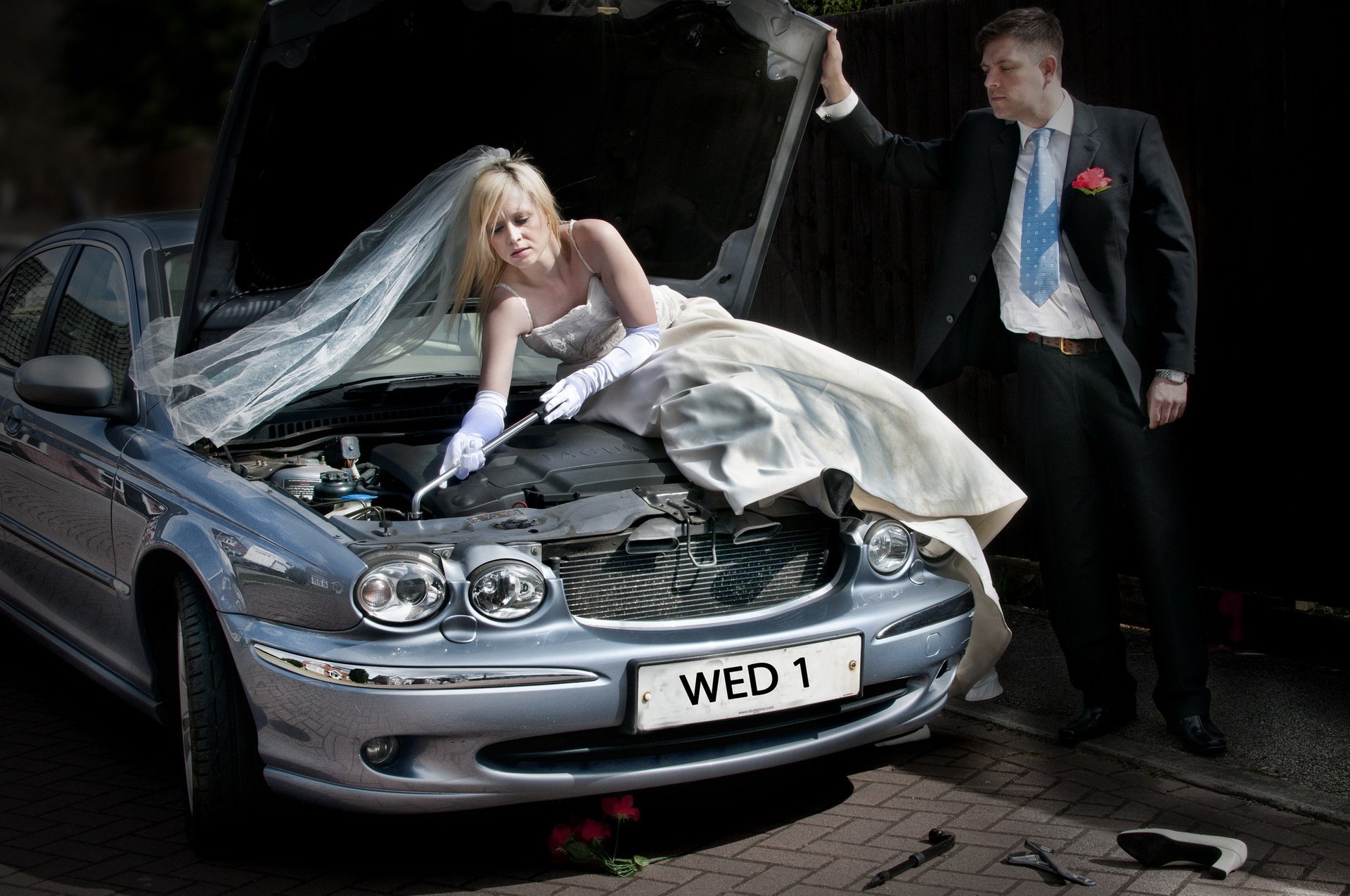 La jeune fille dans une robe de mariée répare la voitureLa jeune fille dans une robe de mariée répare la voiture