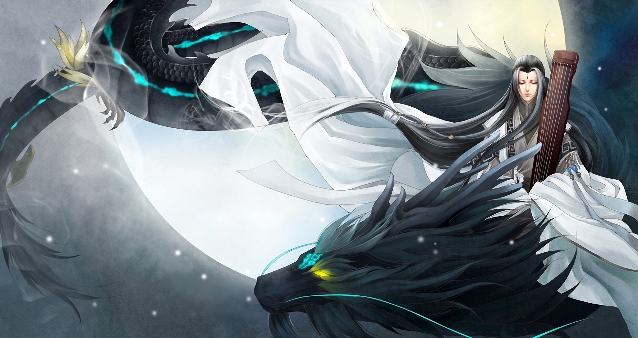 Dragon noir apprivoisé par un homme dans une couverture blanche