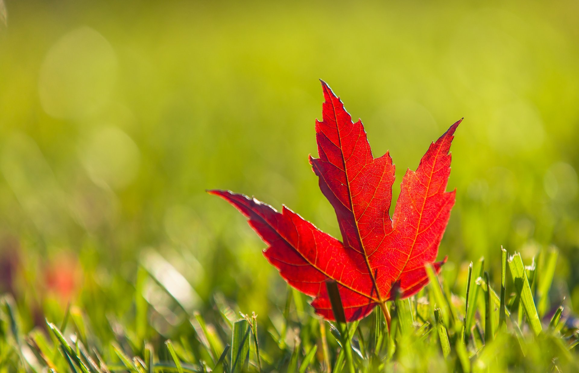 Une feuille d'automne a volé sur une clairière verteUne feuille d'automne a volé sur une clairière verte