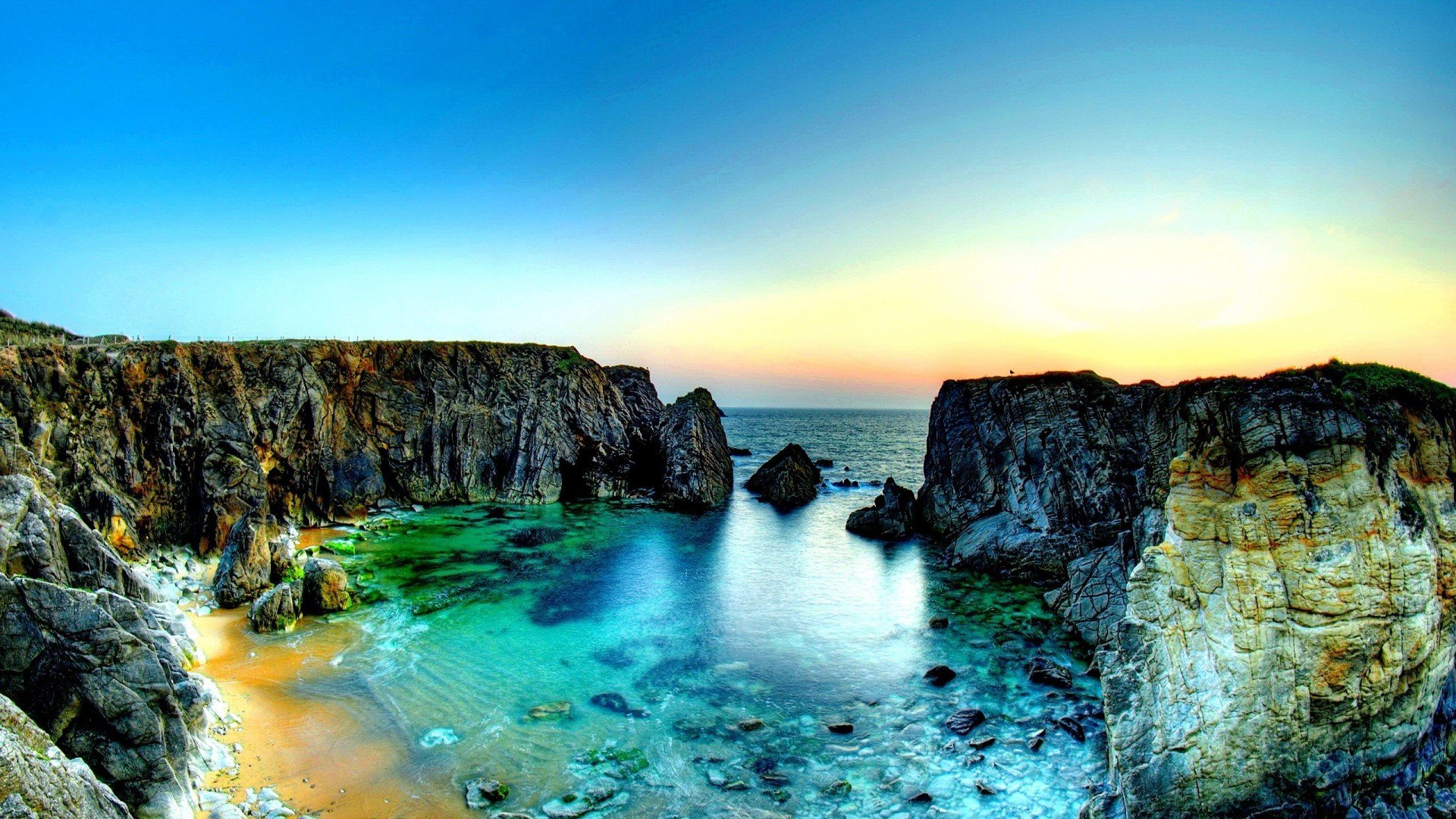 Coucher de soleil chic sur la plage avec des rochersCoucher de soleil chic sur la plage avec des rochers