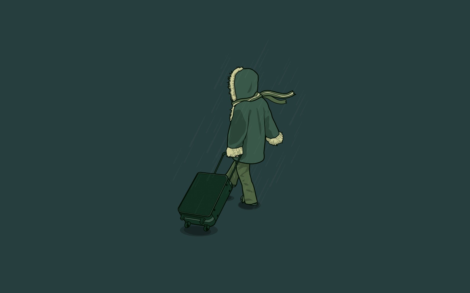 Figure. la jeune fille dans une veste à capuche part avec une valise. fond vert. monochromeFigure. La jeune fille dans une veste à capuche part avec une valise. Fond vert. Monochrome