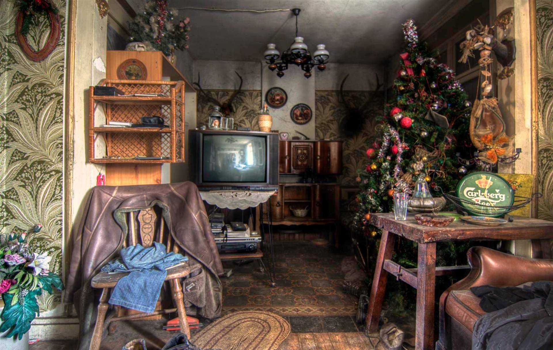 Chambre confortable avec canapé, arbre de noël et décorations de noëlChambre confortable avec canapé, arbre de Noël et décorations de Noël