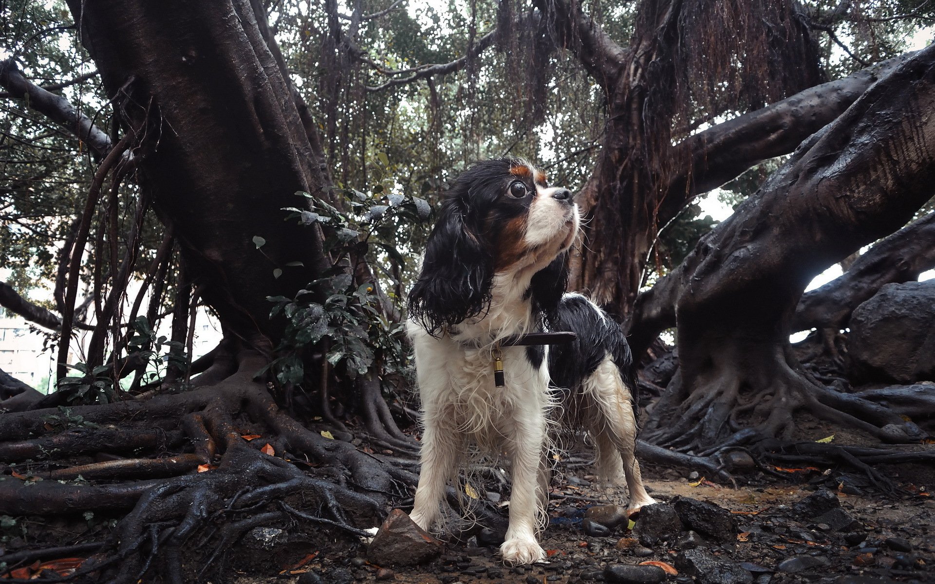 Chien rouge-blanc en regardant la caméra sur fond de fleurs violettes