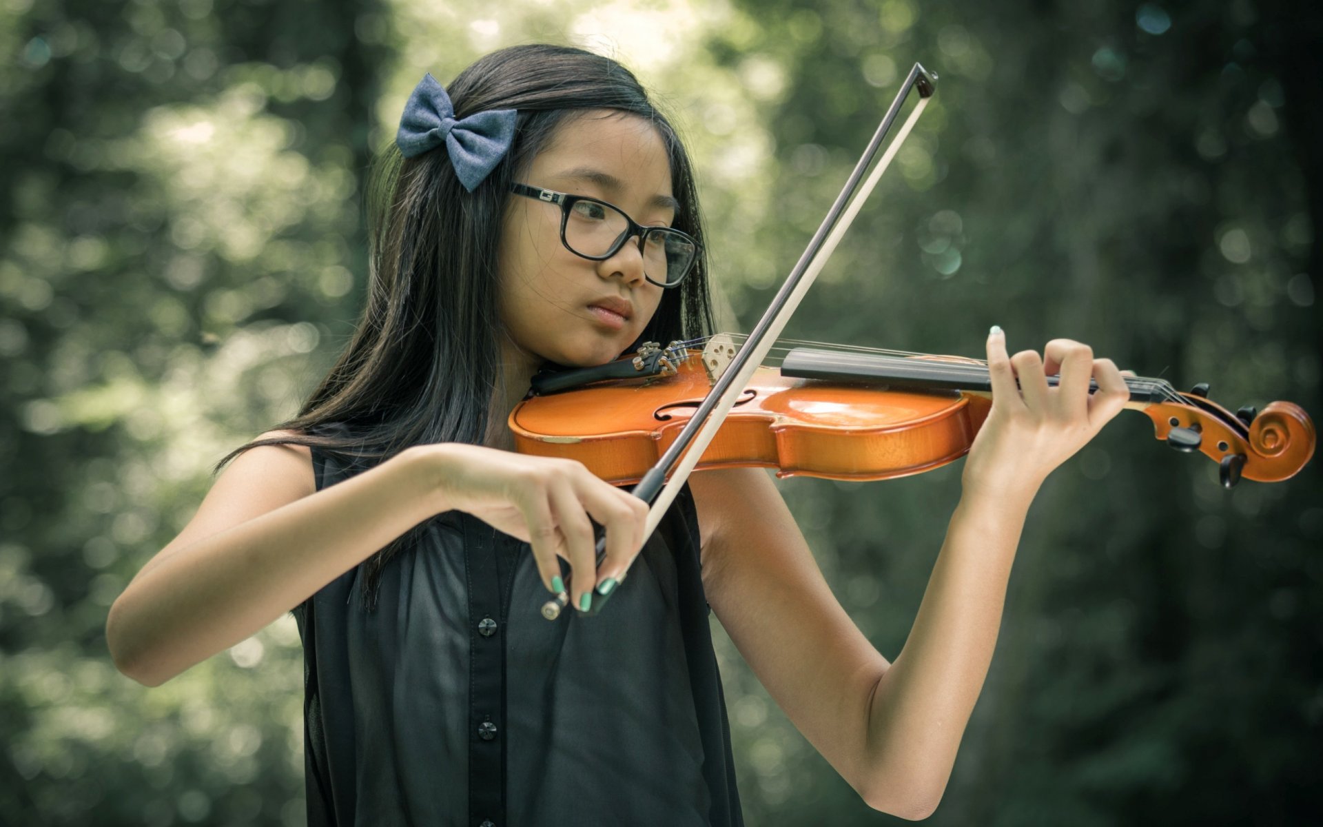 Dans la forêt musicale, la violoniste hannah thiem pose dans une belle robeDans la forêt musicale, la violoniste Hannah thiem pose dans une belle robe