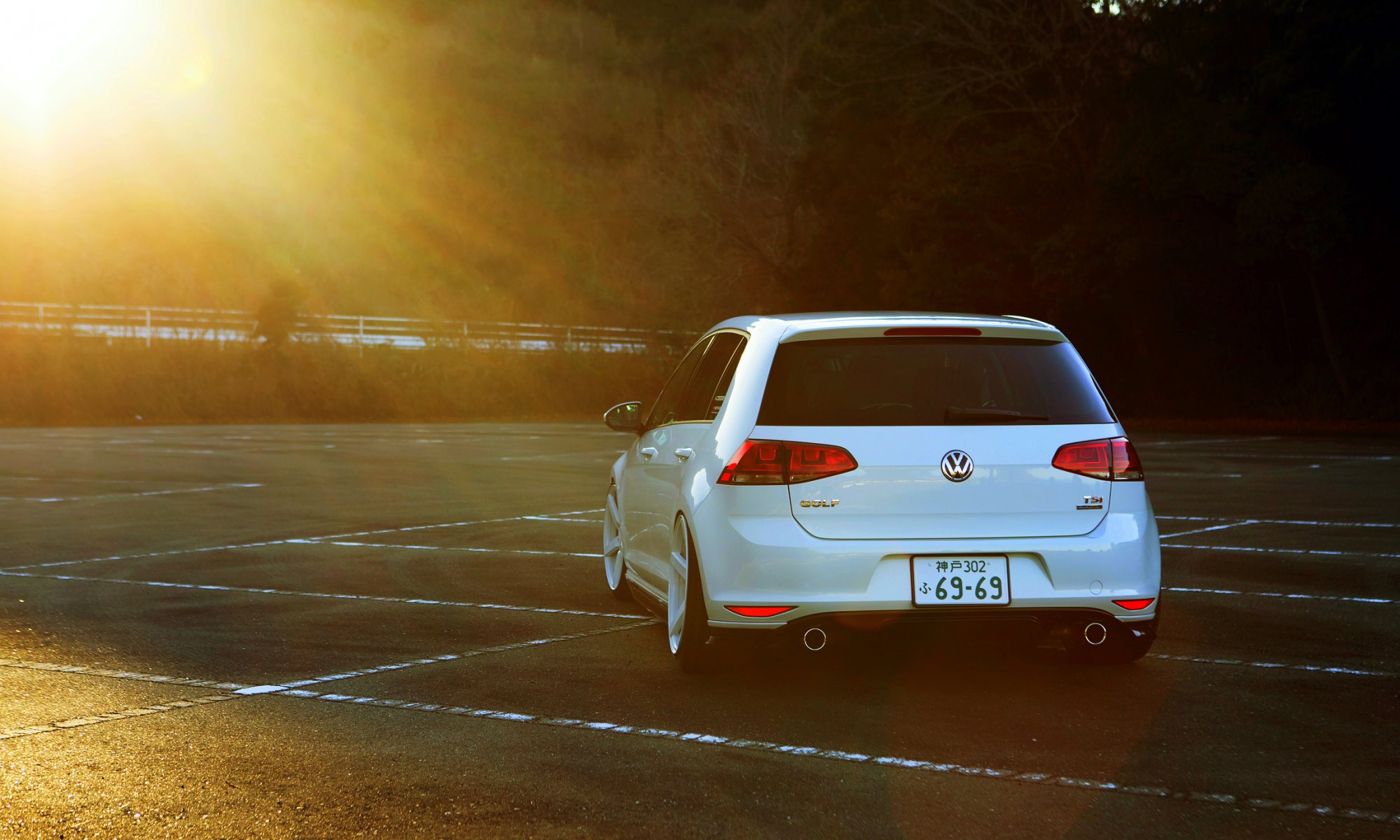 Volkswagen golf bleu sur fond de beau coucher de soleilVolkswagen Golf bleu sur fond de beau coucher de soleil