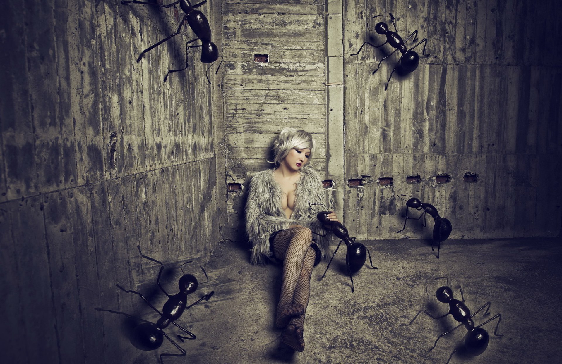 Fille assise sur le sable dans la Grange avec d'énormes fourmis