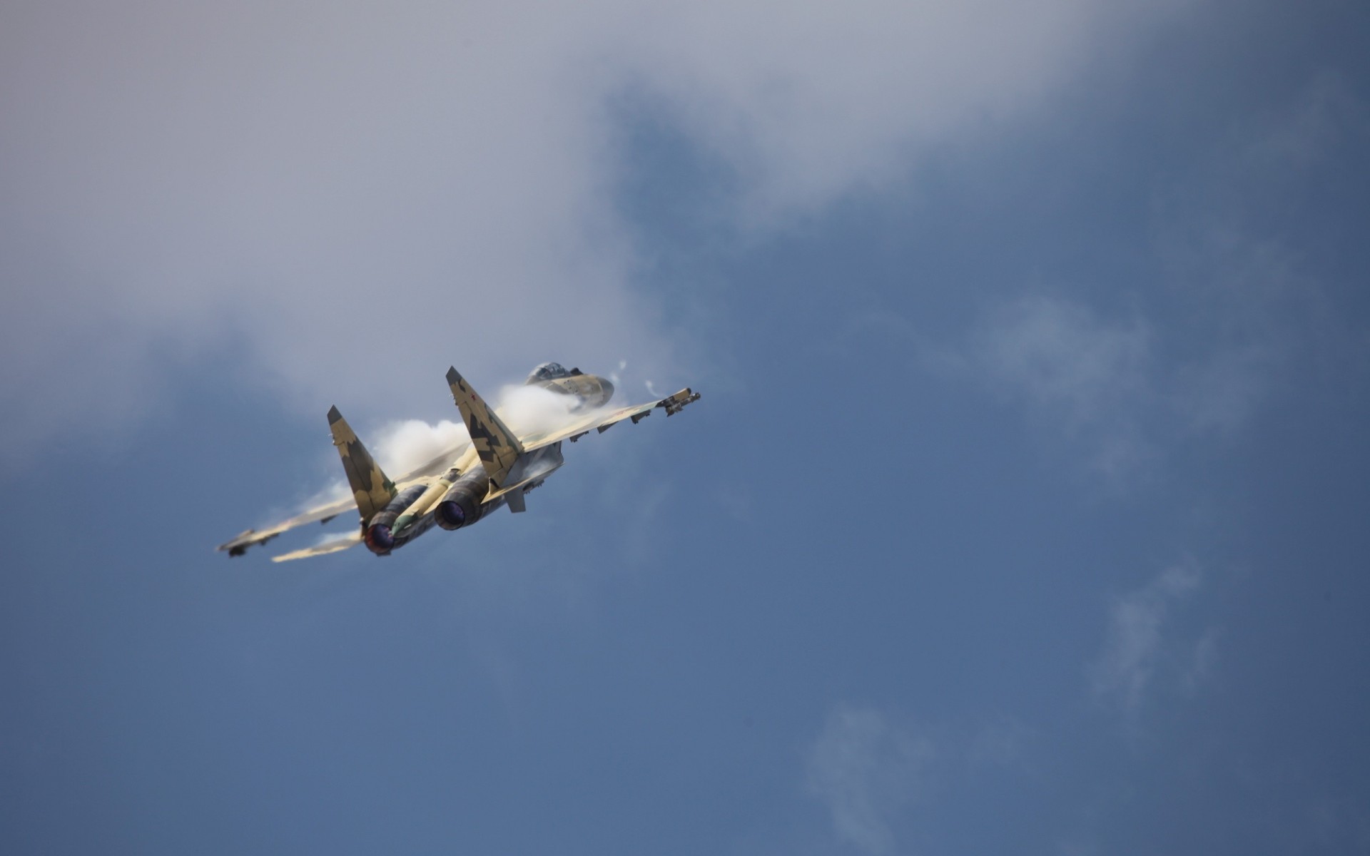 Dans la soirée, l'avion décolle et plane au-dessus du ciel bleu