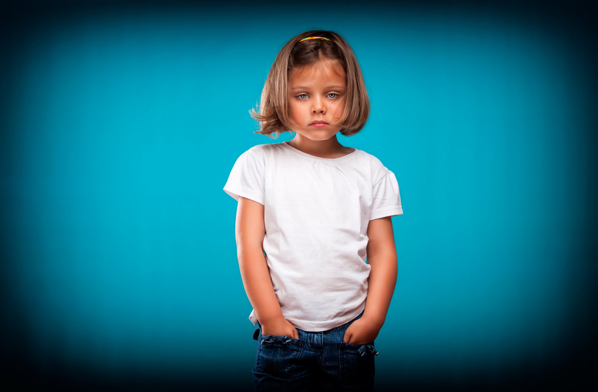 Portrait d'une jeune fille à la recherche sur fond bleu