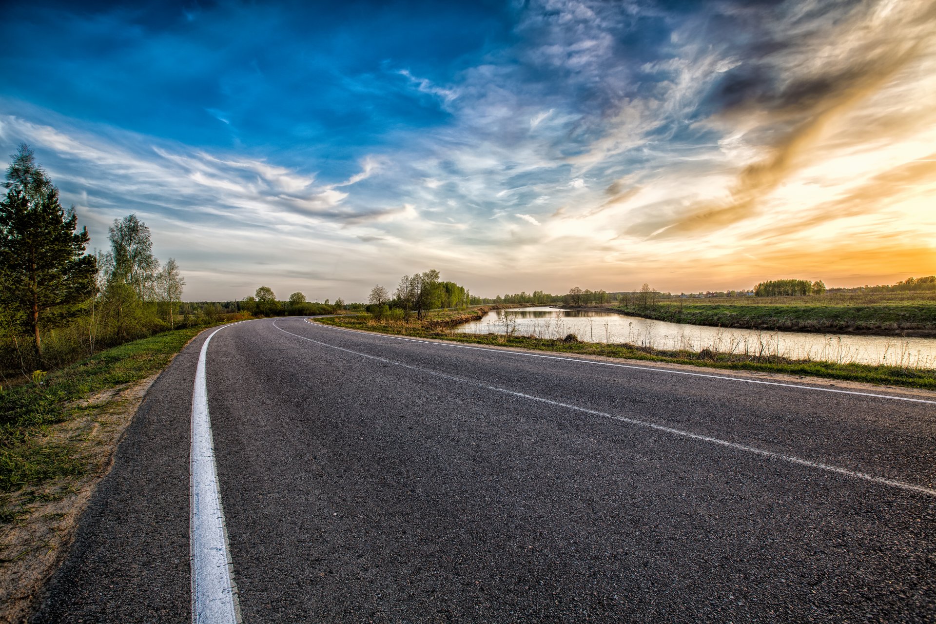 Mitsubishi lancer rouge se précipite le long de la route entre les champs et les arbresMitsubishi lancer rouge se précipite le long de la route entre les champs et les arbres