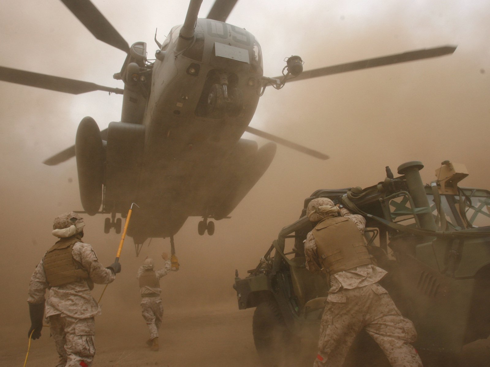Une jeep de combat est amenée à un hélicoptère cargoUne Jeep de combat est amenée à un hélicoptère cargo