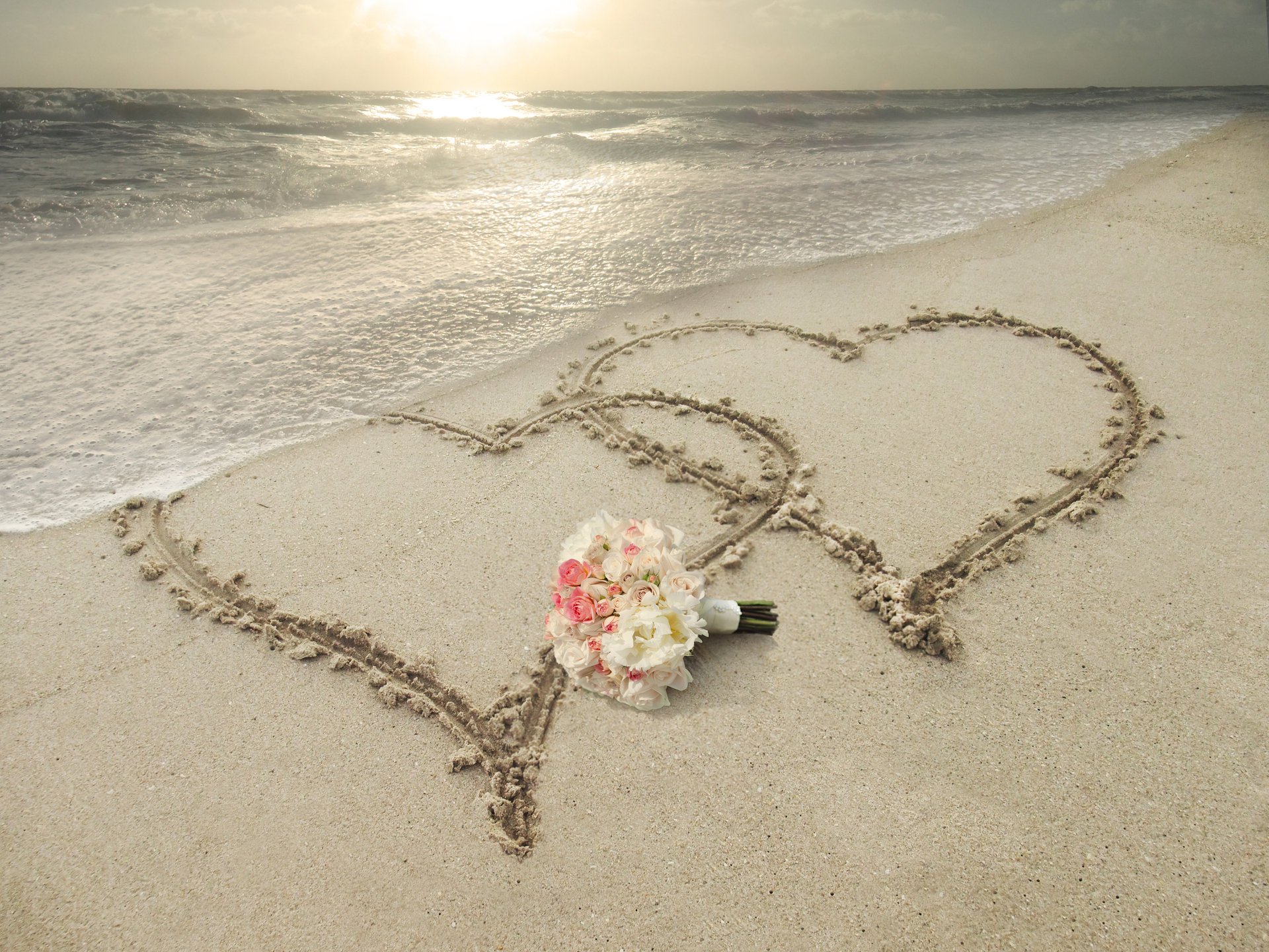 Deux coeurs dessinés sur une plage de sable