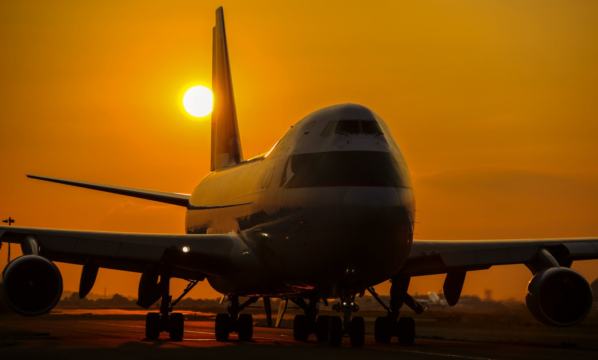 Avion de passagers Boeing-747a sur fond de coucher de soleil