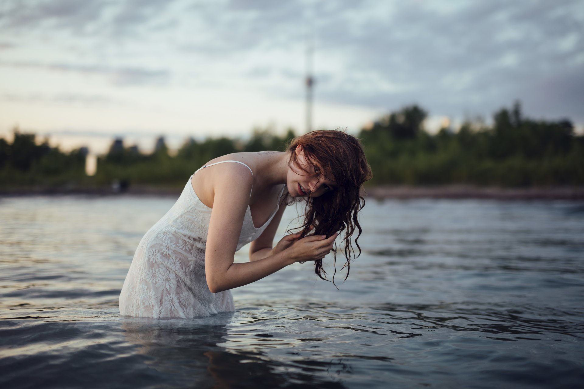 Fille avec des taches de rousseur et les cheveux mouillés dans l'eau