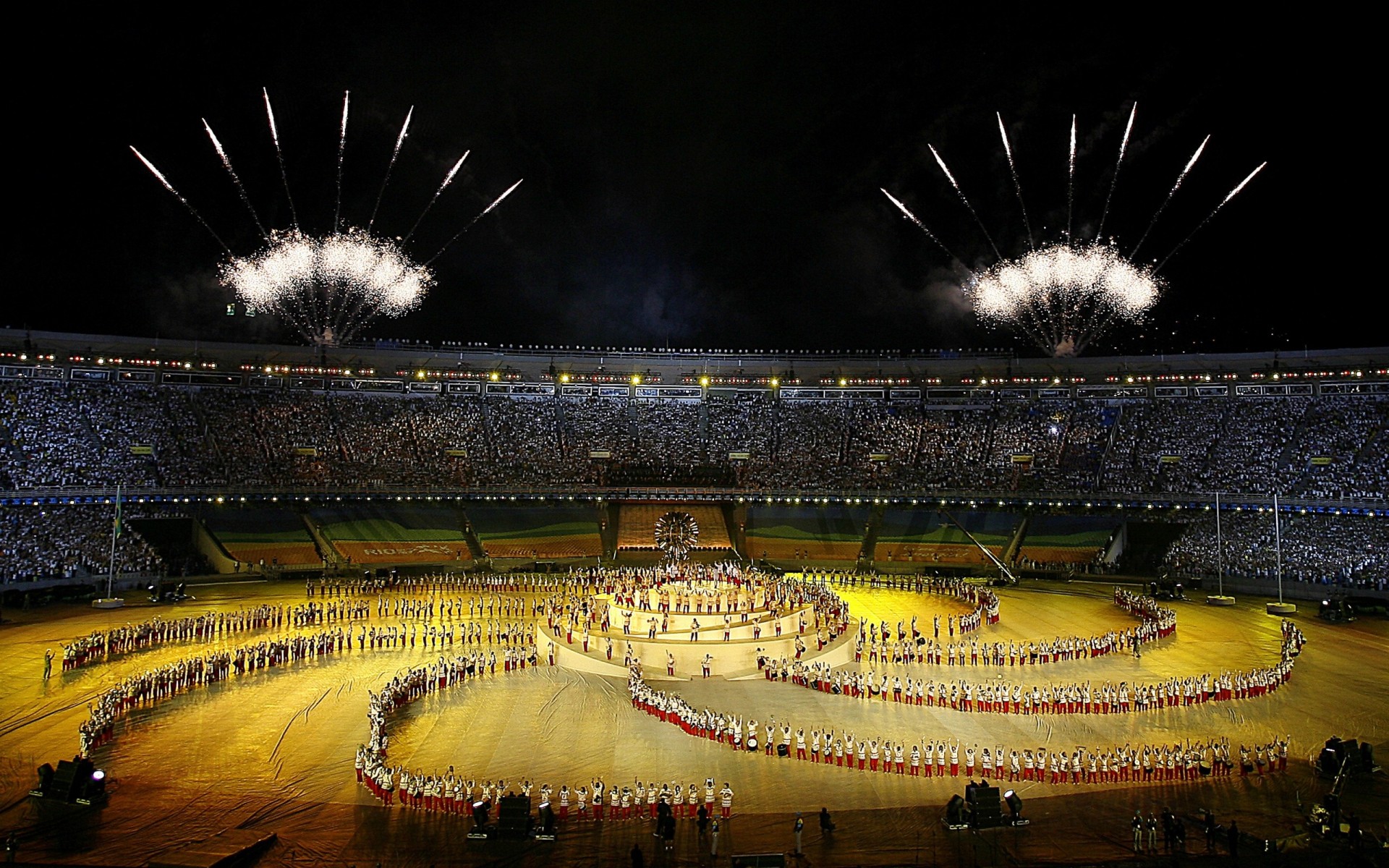 Feux d'artifice au-dessus de l'arène sportive pendant la cérémonie