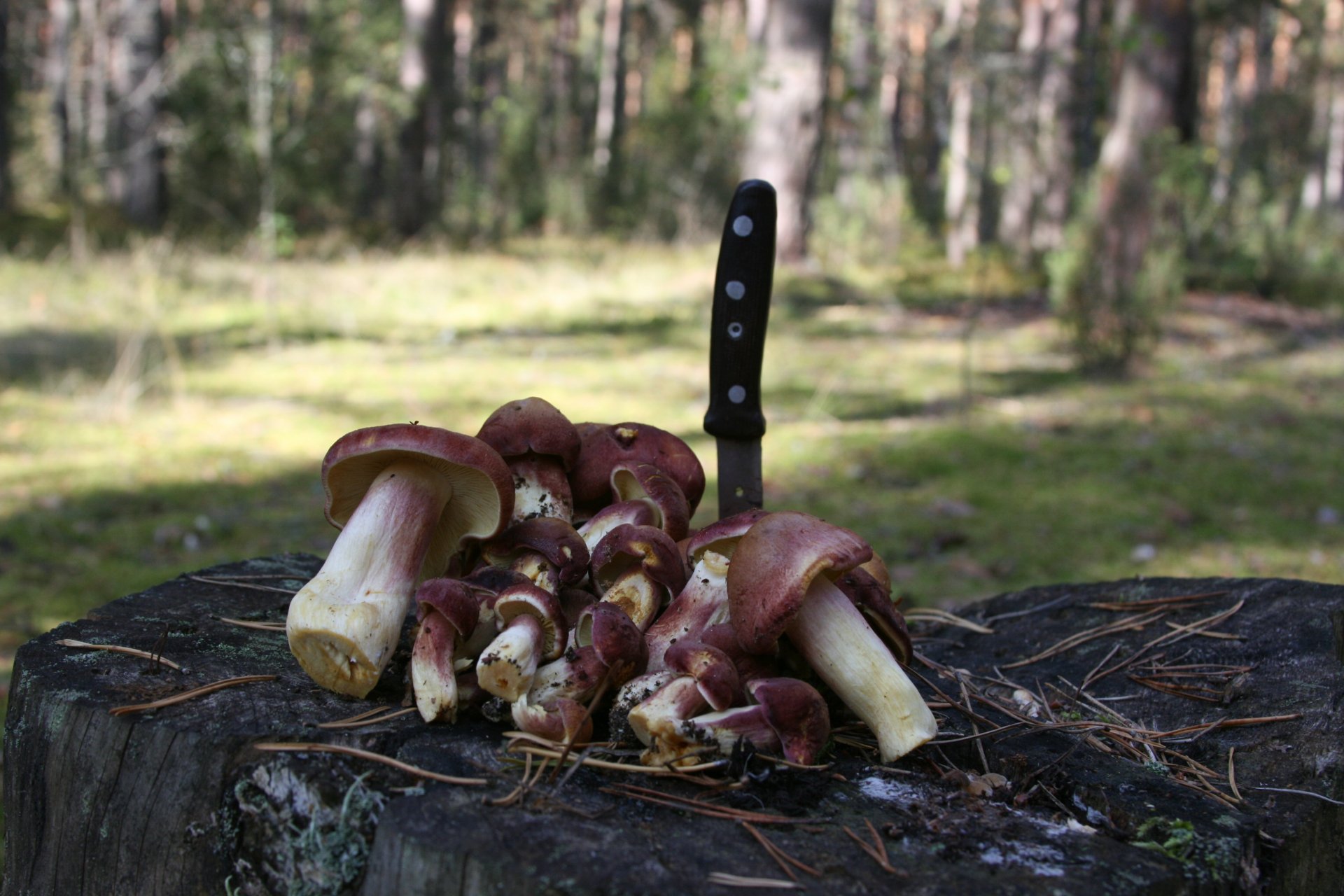 Champignons sur le chanvre avec un couteau dans la forêt