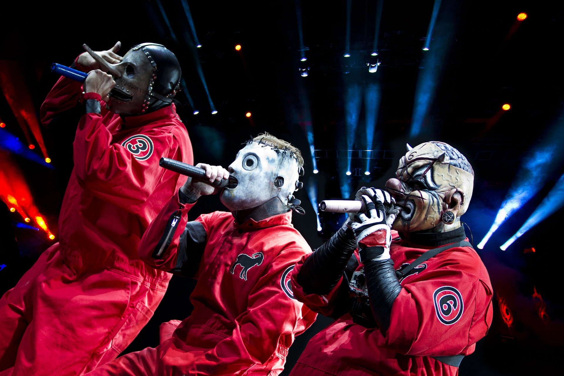 Sean Crahon, Corey Taylor, Chris fen en costumes rouges interprètent leurs chansons