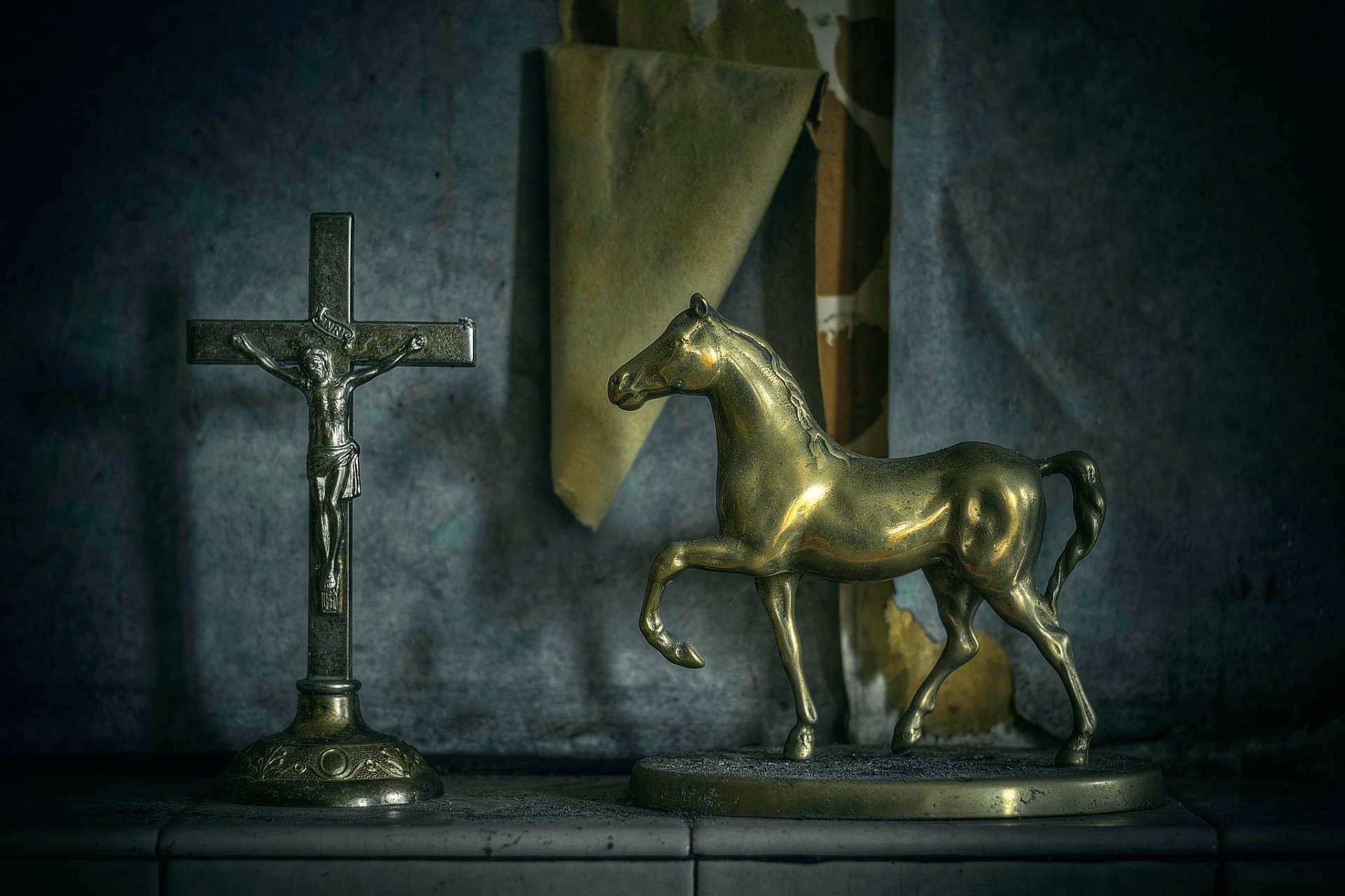 Sur le fond du papier peint qui s'est éloigné du mur, il y a une statuette de cheval et un crucifix