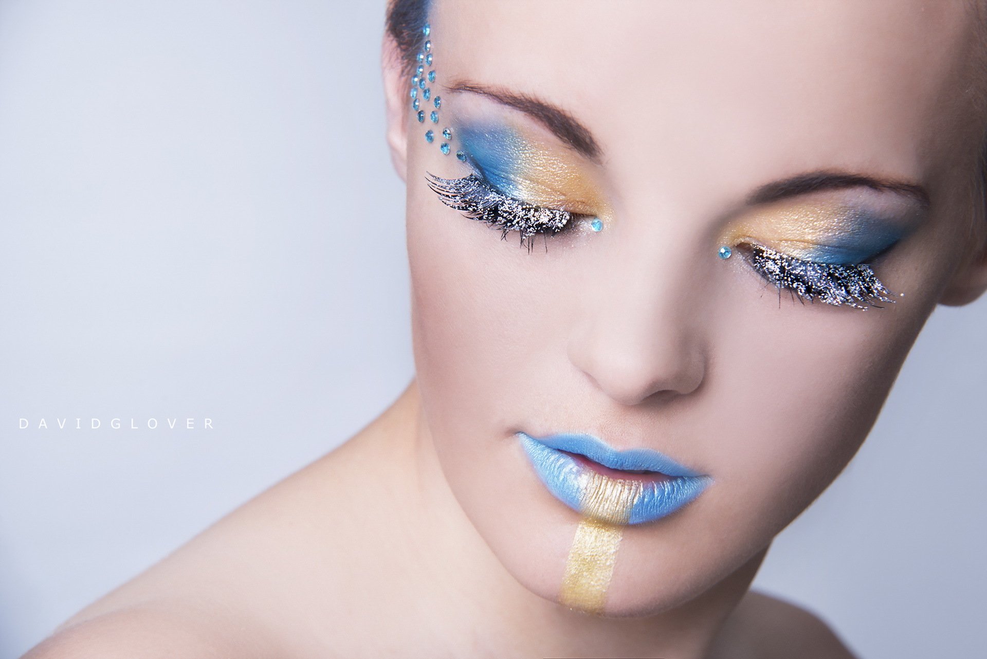 Visage de fille regardant vers le bas avec un beau maquillage pour les yeux et les lèvres dans une teinte bleu-jaunâtre