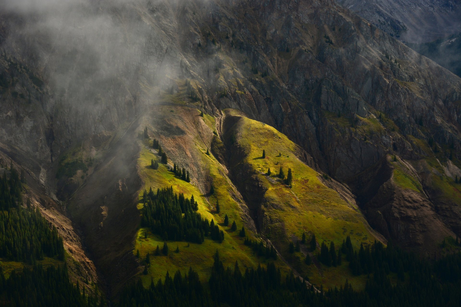 Arbres dans la région montagneuse dans le brouillard