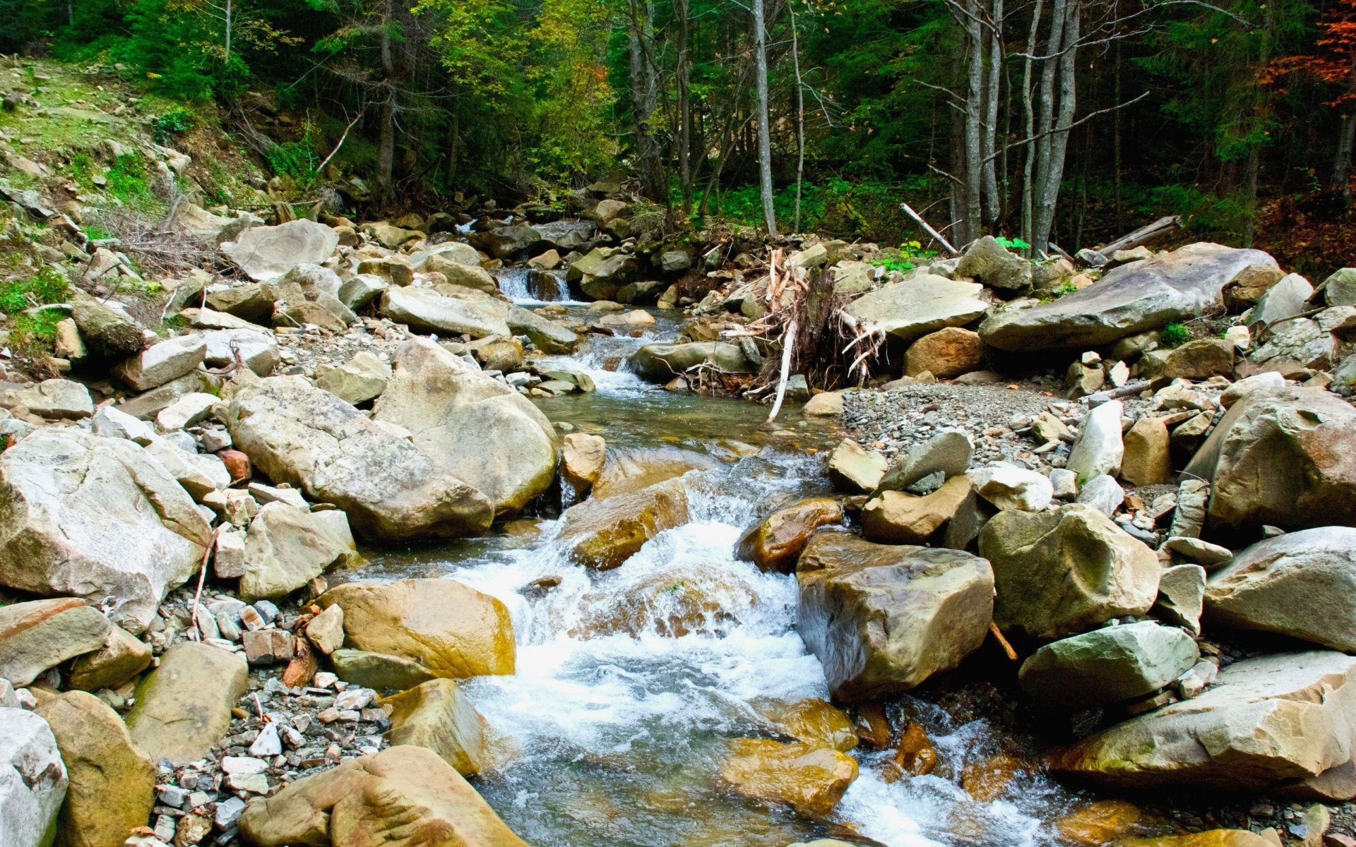 Chute d'eau sur fond de feuilles multicolores d'automne