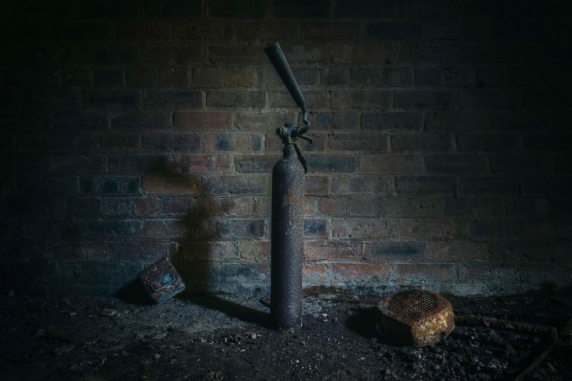 Extincteur et signe d'extincteur sur fond rouge dans le minimalisme