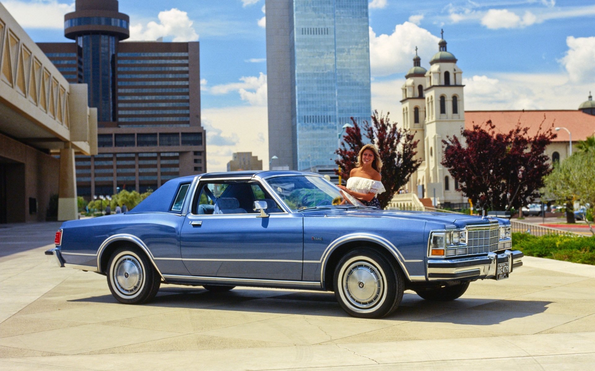 Belle voiture de 1979 sur le fond de l'église, et une belle fille